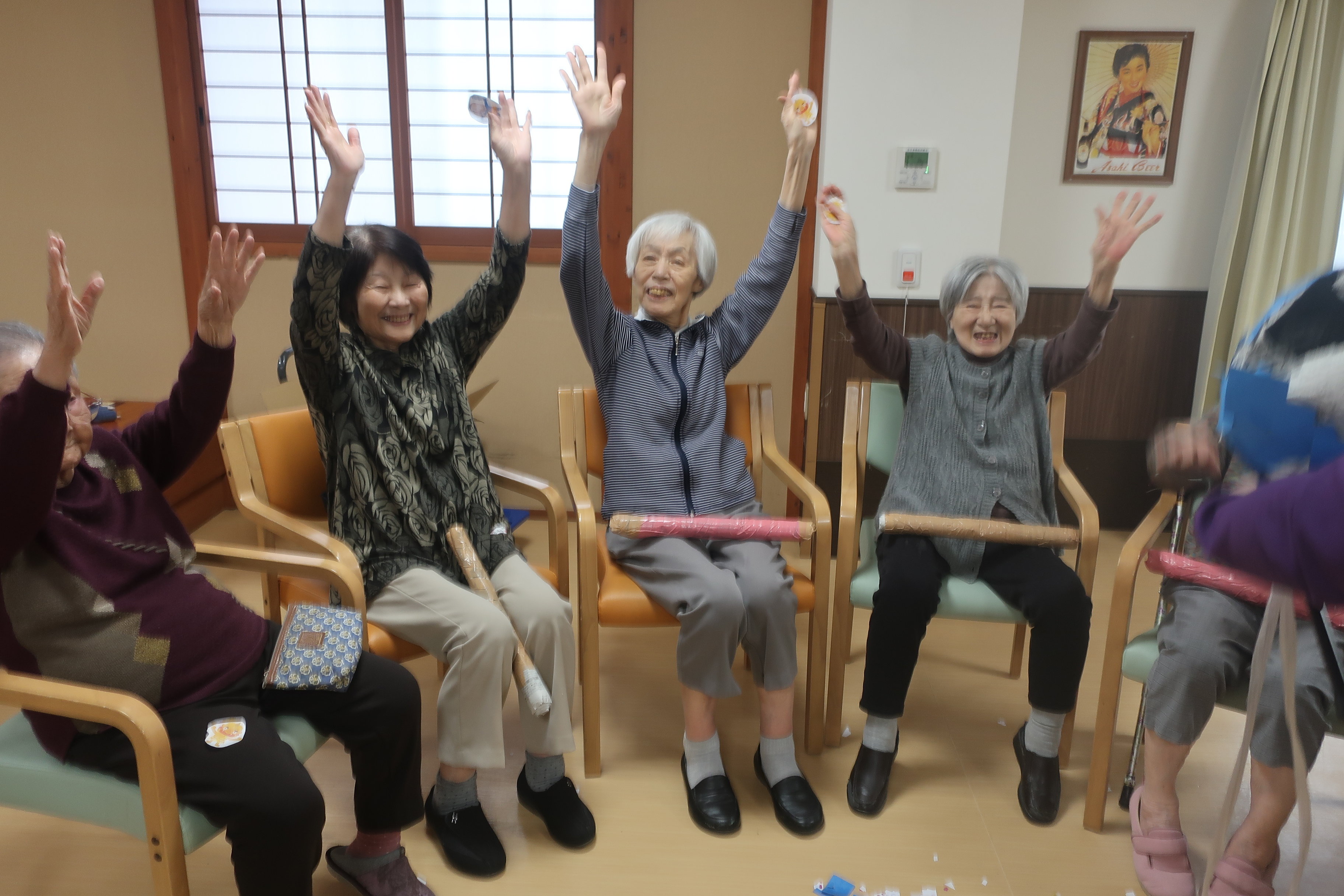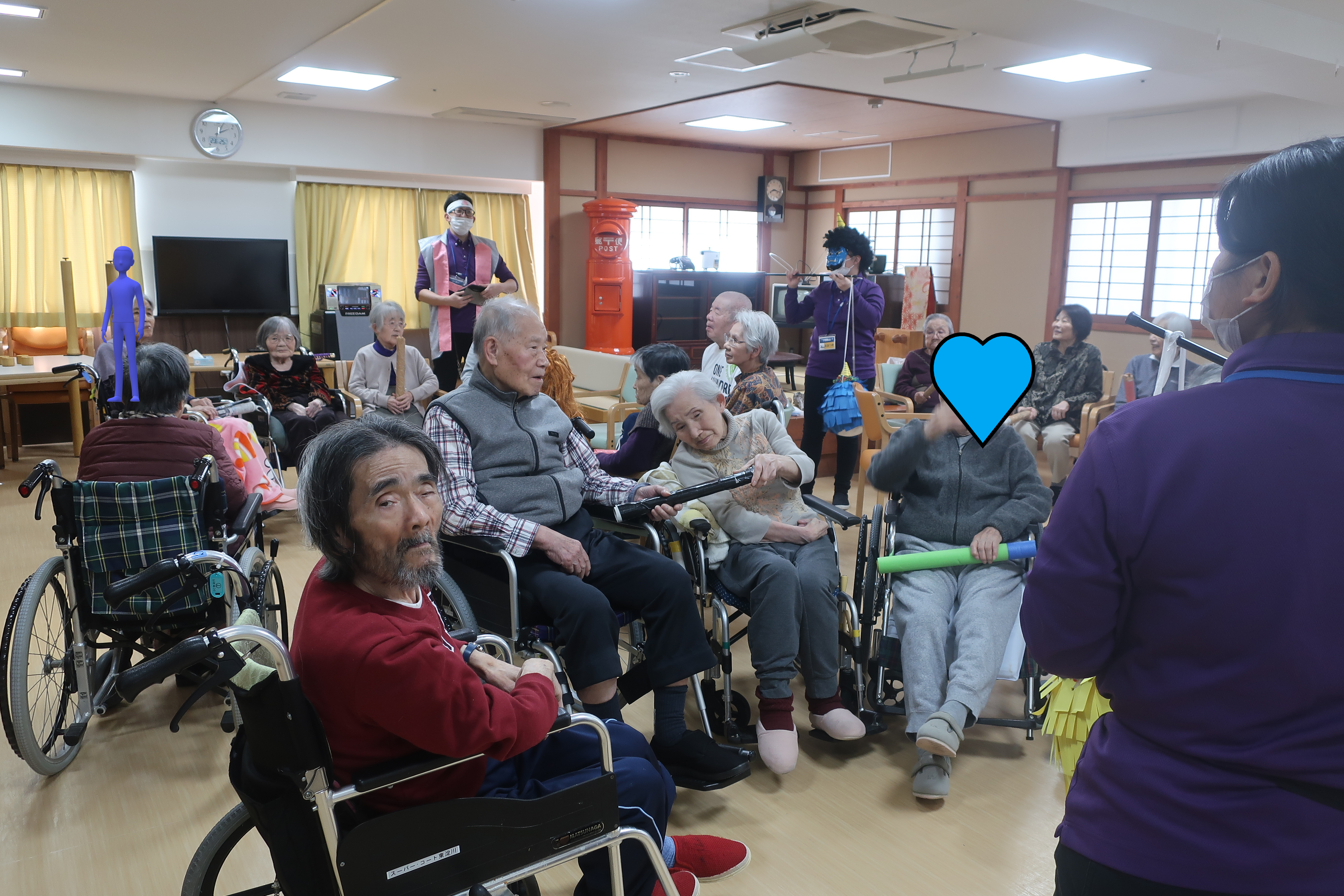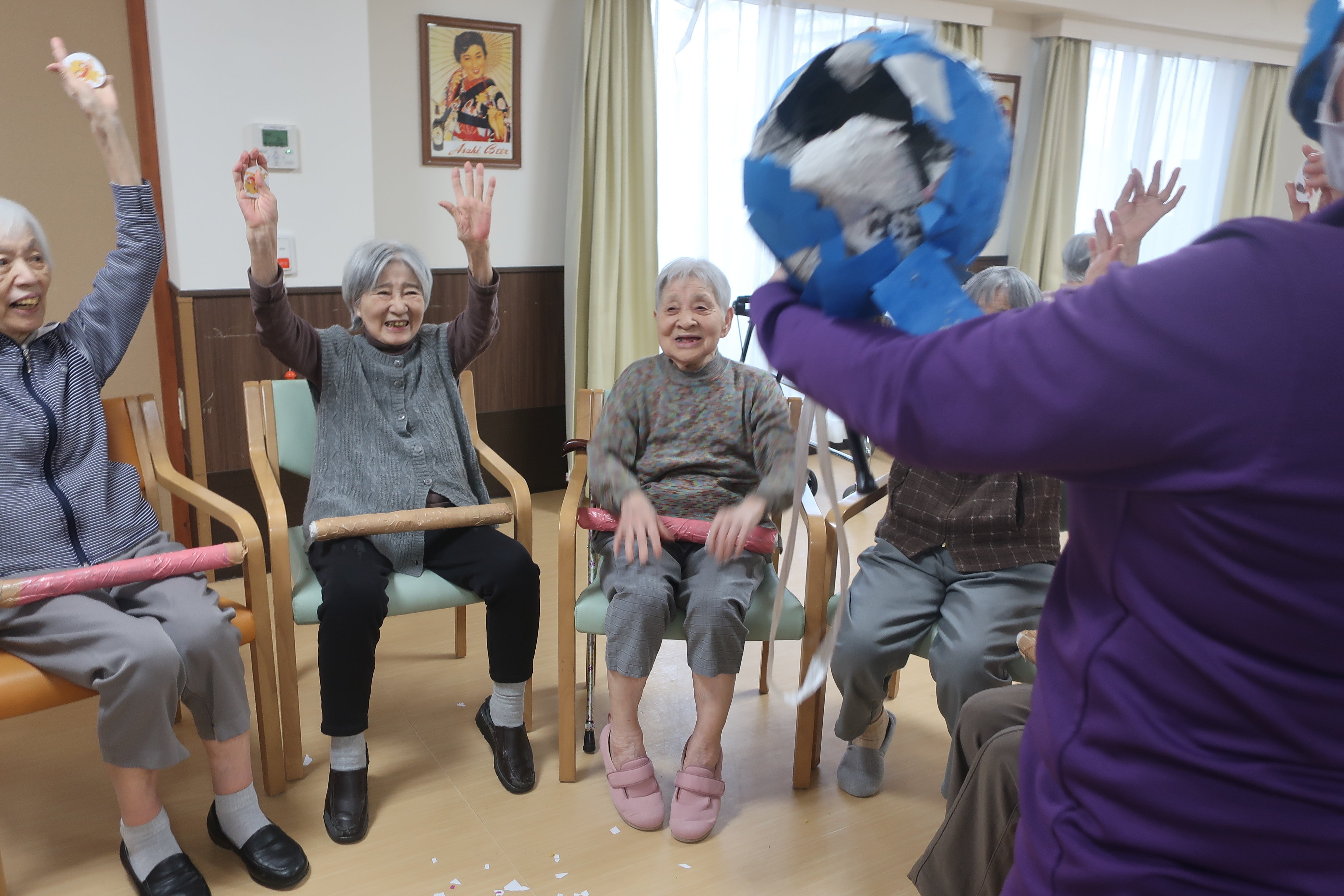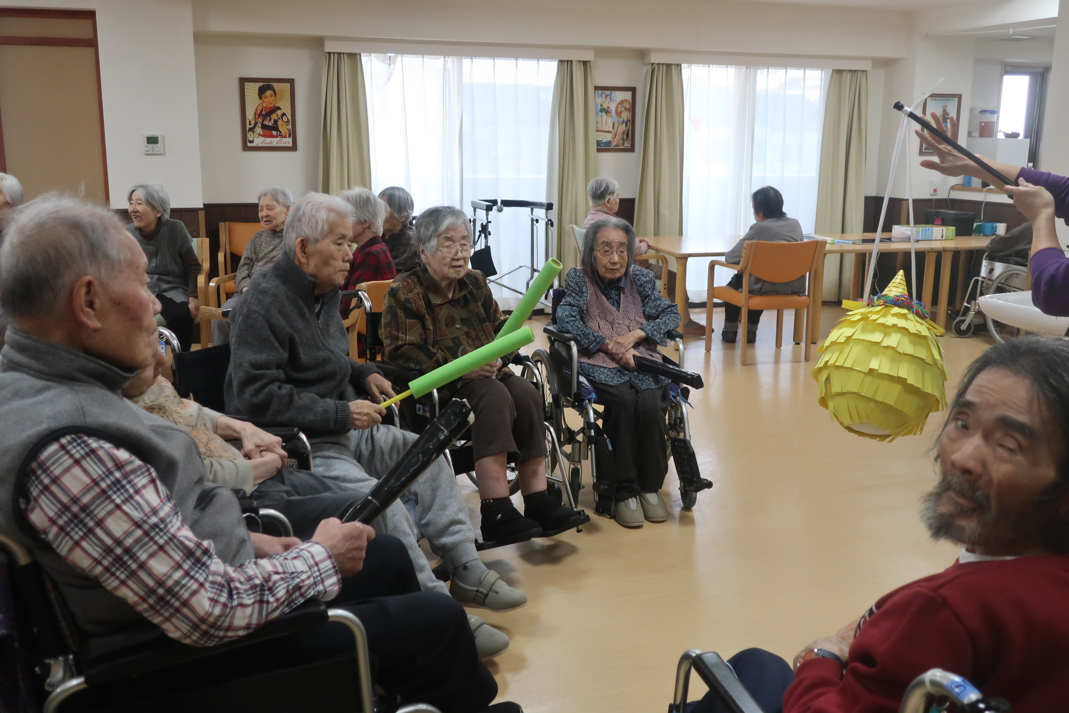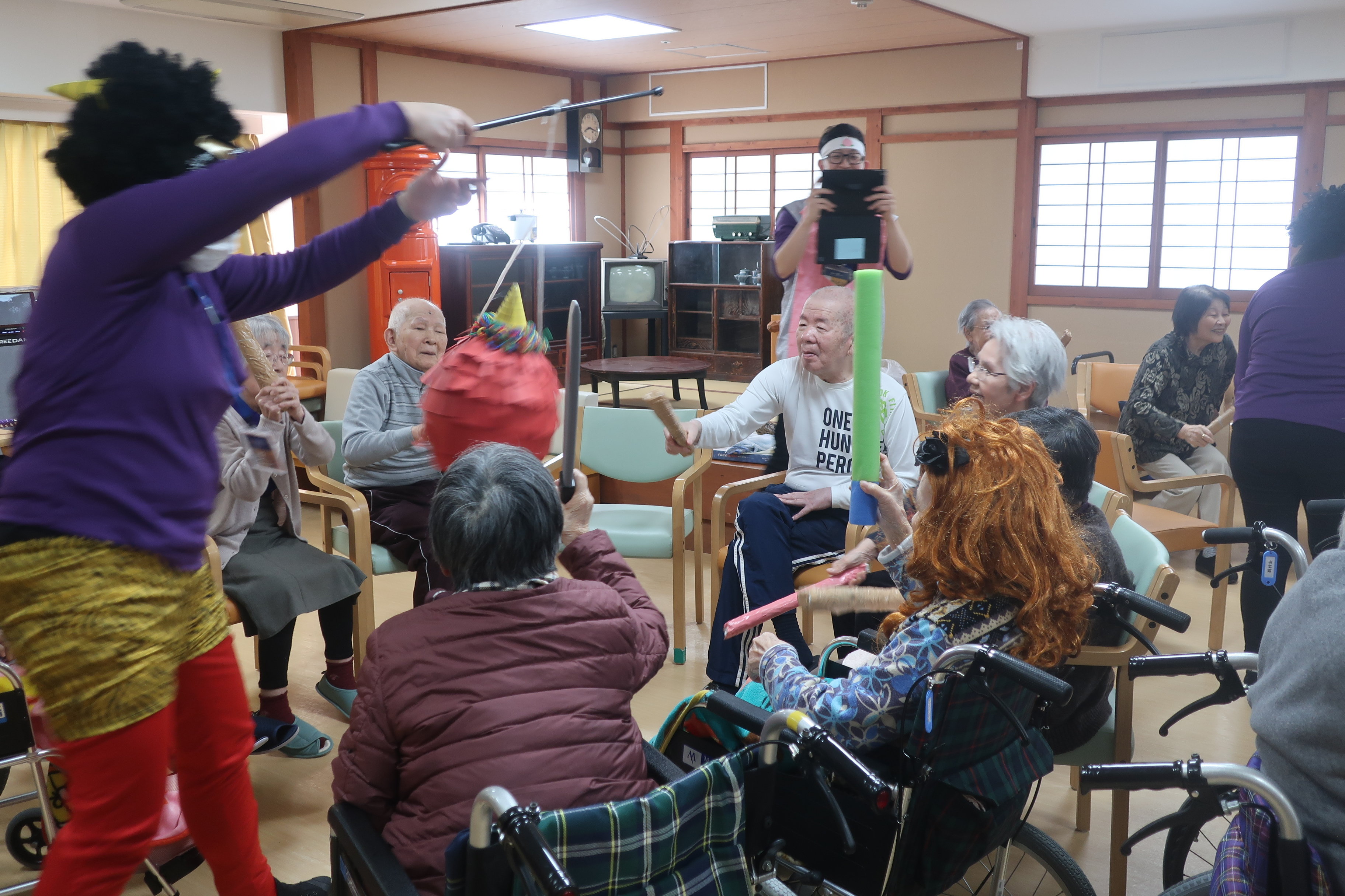 鬼のくす玉割、楽しそうですね!鬼がぐるぐる回転してご入居者の勢いもすごそうです。鬼モチーフのお菓子もおいしそうです。