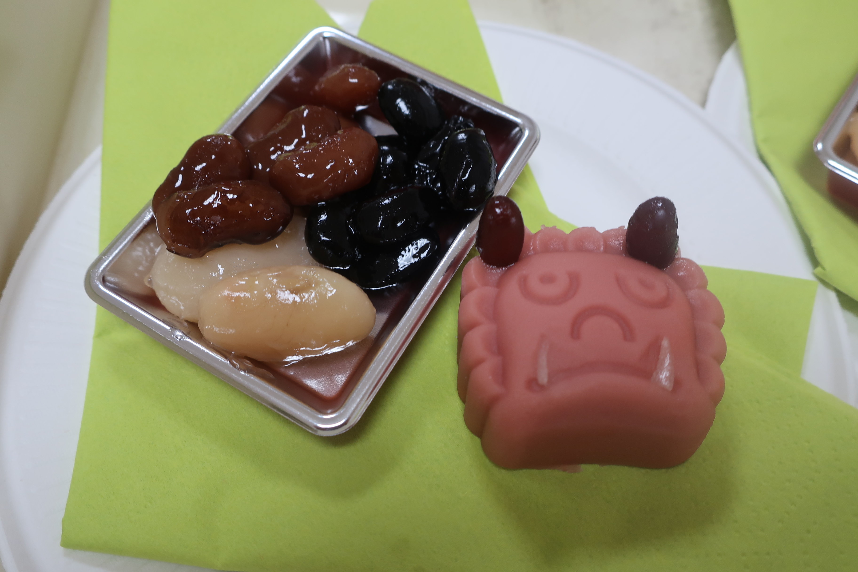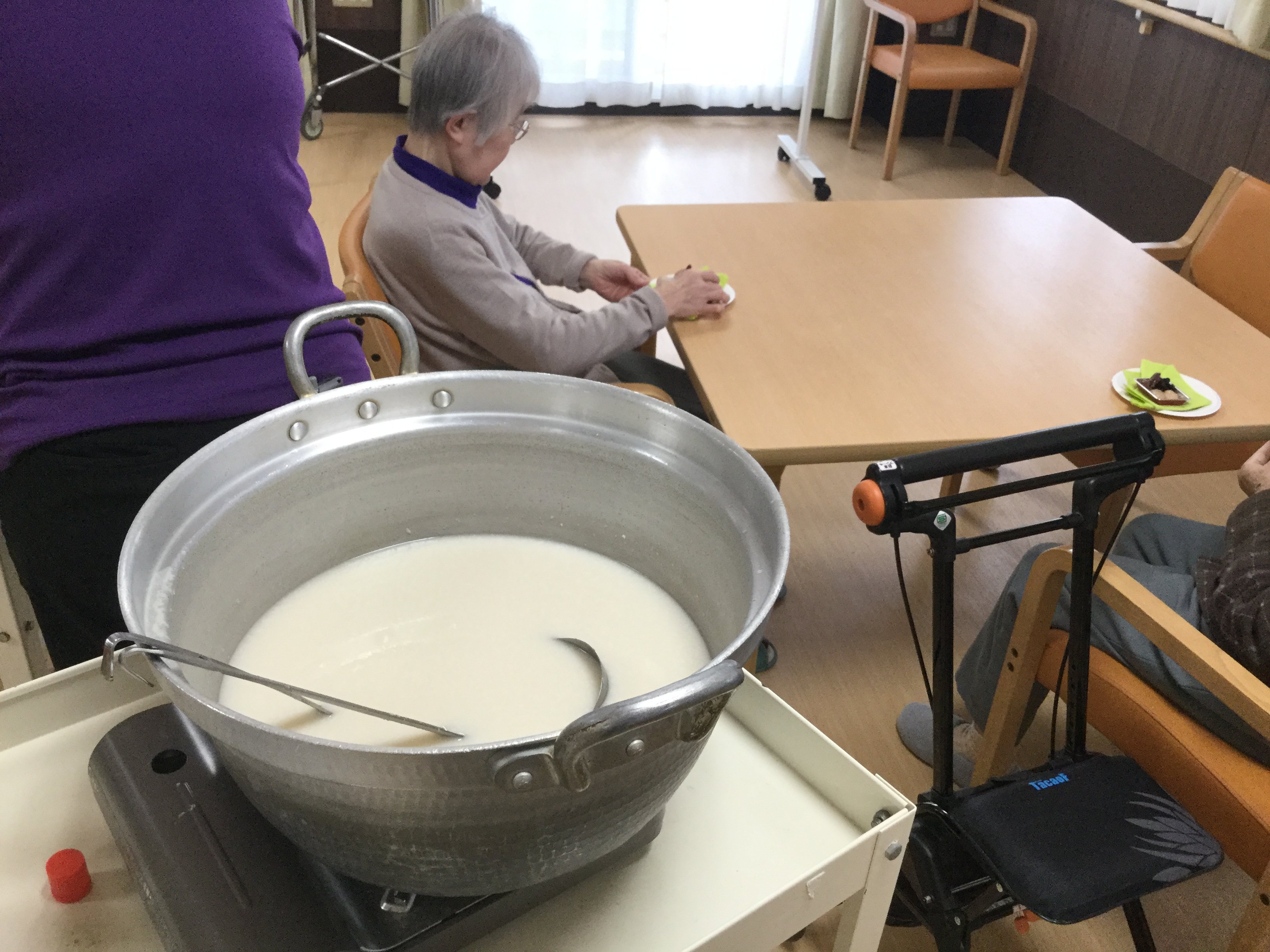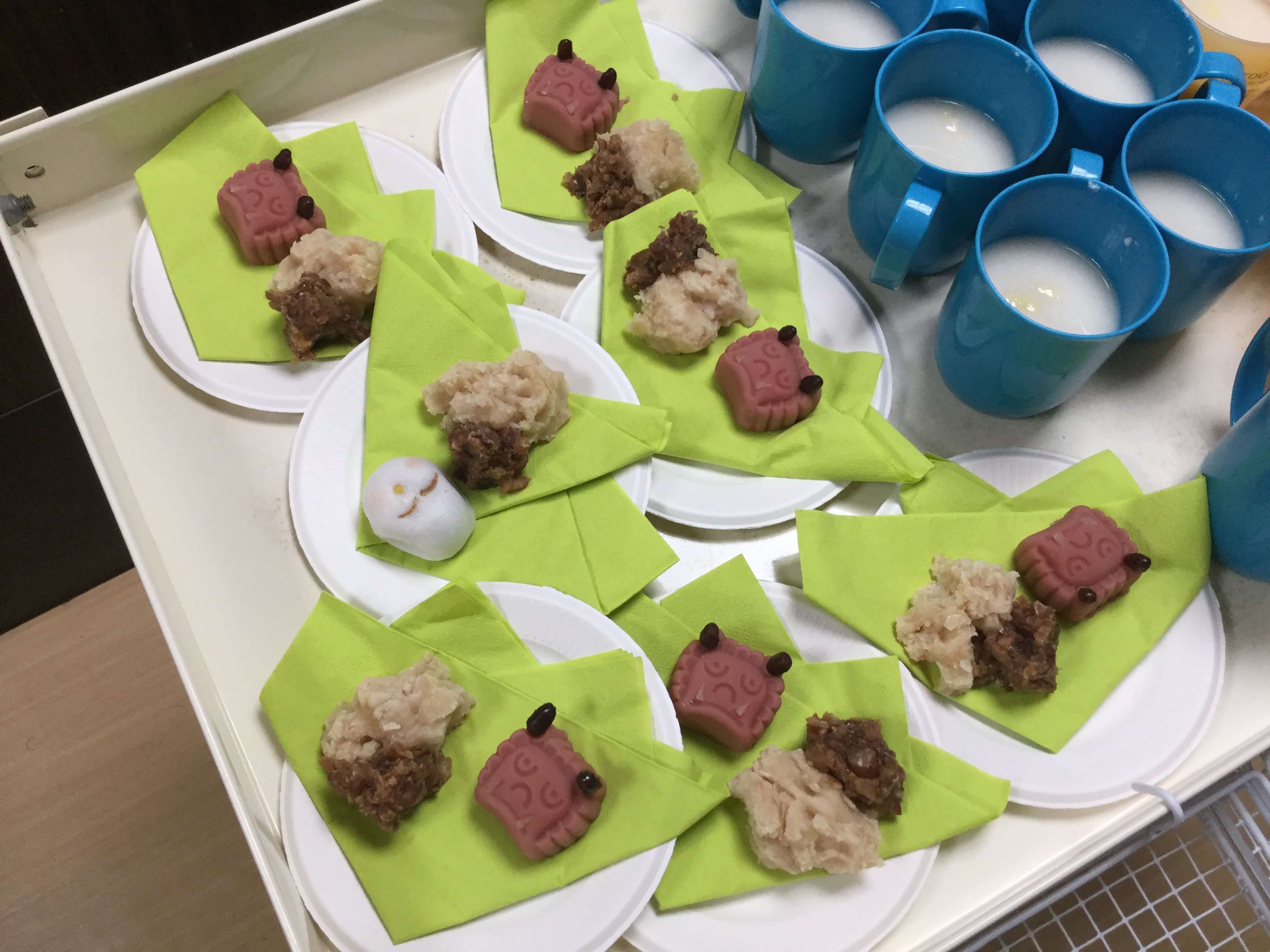 さて今回のおやつは、和菓子と、煮豆、飲み物は、甘酒を提供しました