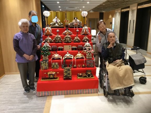 当施設では、2月の中旬頃から3月3日まで1階のロビーに7段のひな壇を飾っていました。ご入居者様がわざ