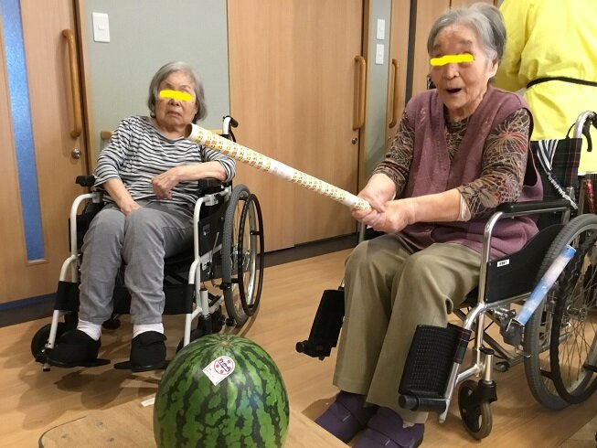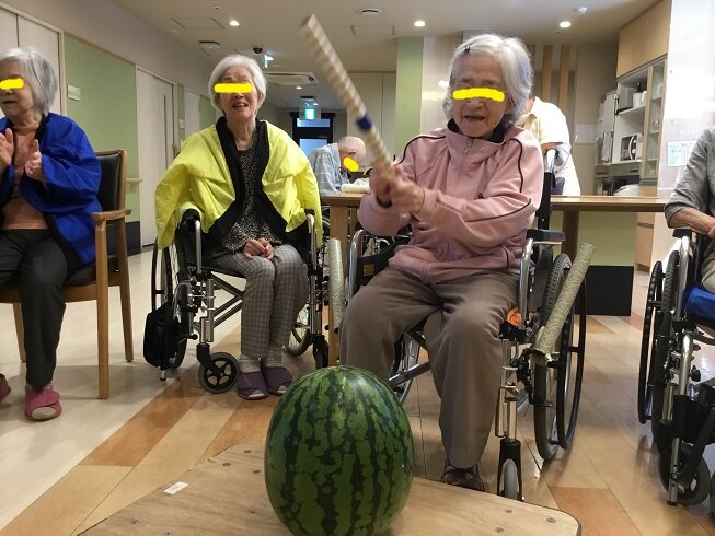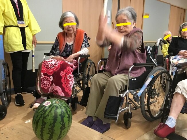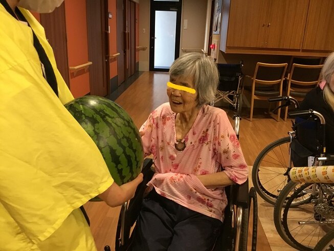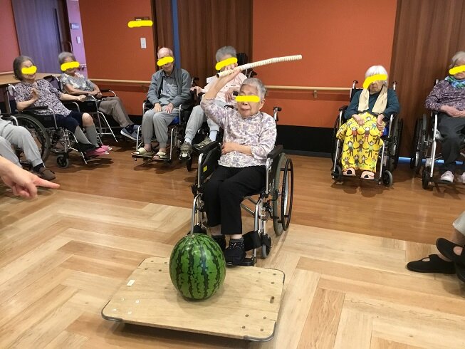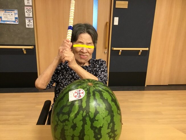 コロナで外出する事が出来ない施設生活の中で夏を感じて頂く事が難しい中、8月末にスイカ割り