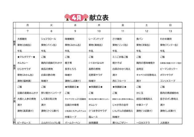 4月7日(月)~13日(日)の献立表を掲載させて頂きます。
