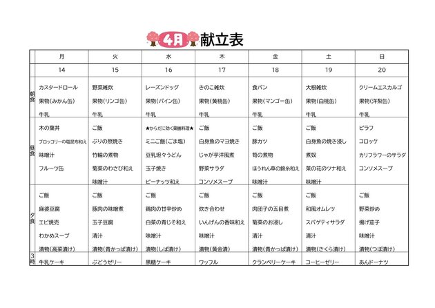 4月14日(月)~20日(日)の献立を掲載させて頂きます。