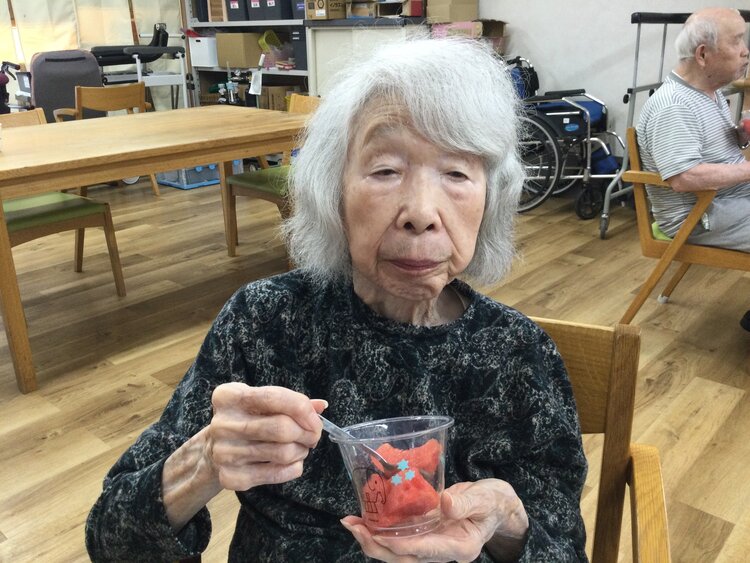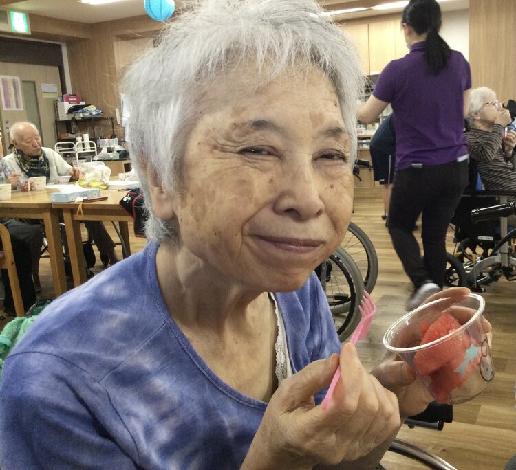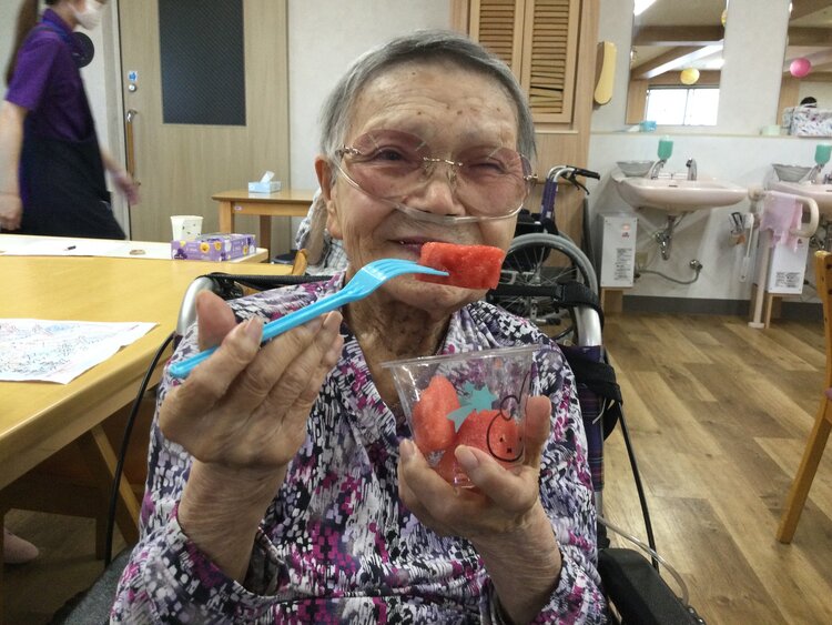 もちろん皆さんに夏を感じていただけるよう、きざみ食の方へは小さく刻んで、ムース色の方へはたくさんの果汁をゼリーにして召し上がっていただき、「甘くて美味しいね!」「スイカ割も楽しかったよ!」とたくさん喜んでいただけました(*^^*)