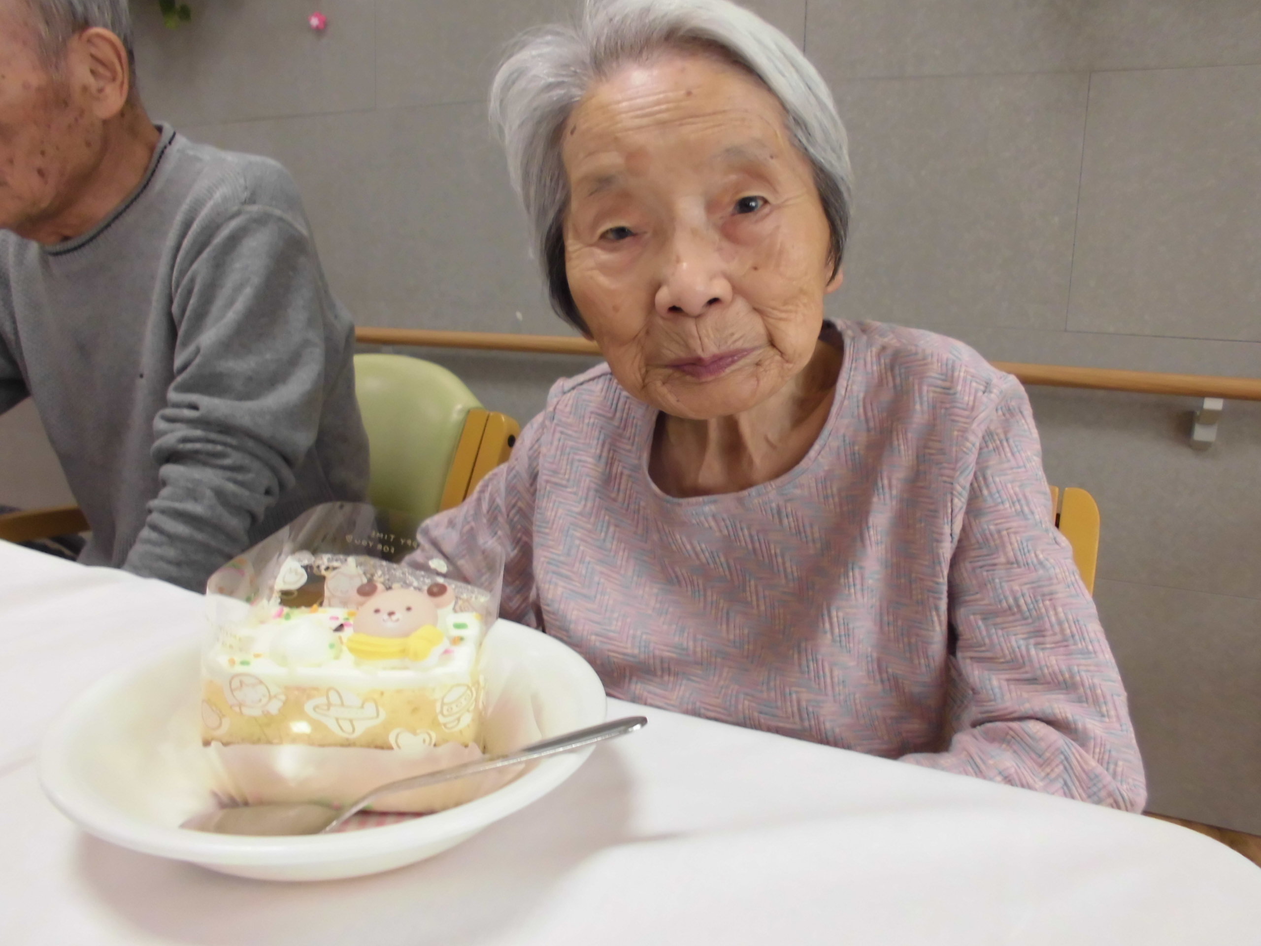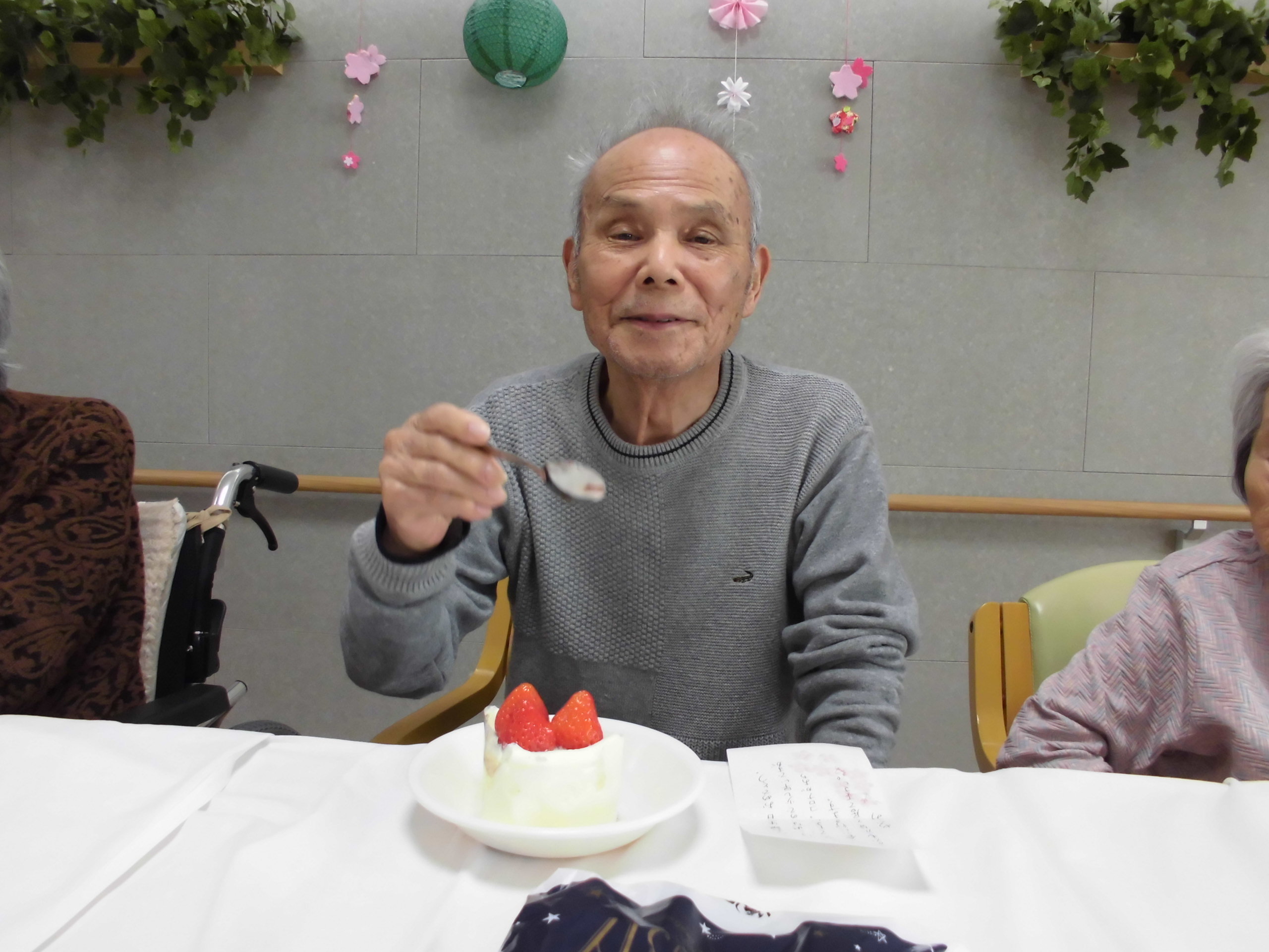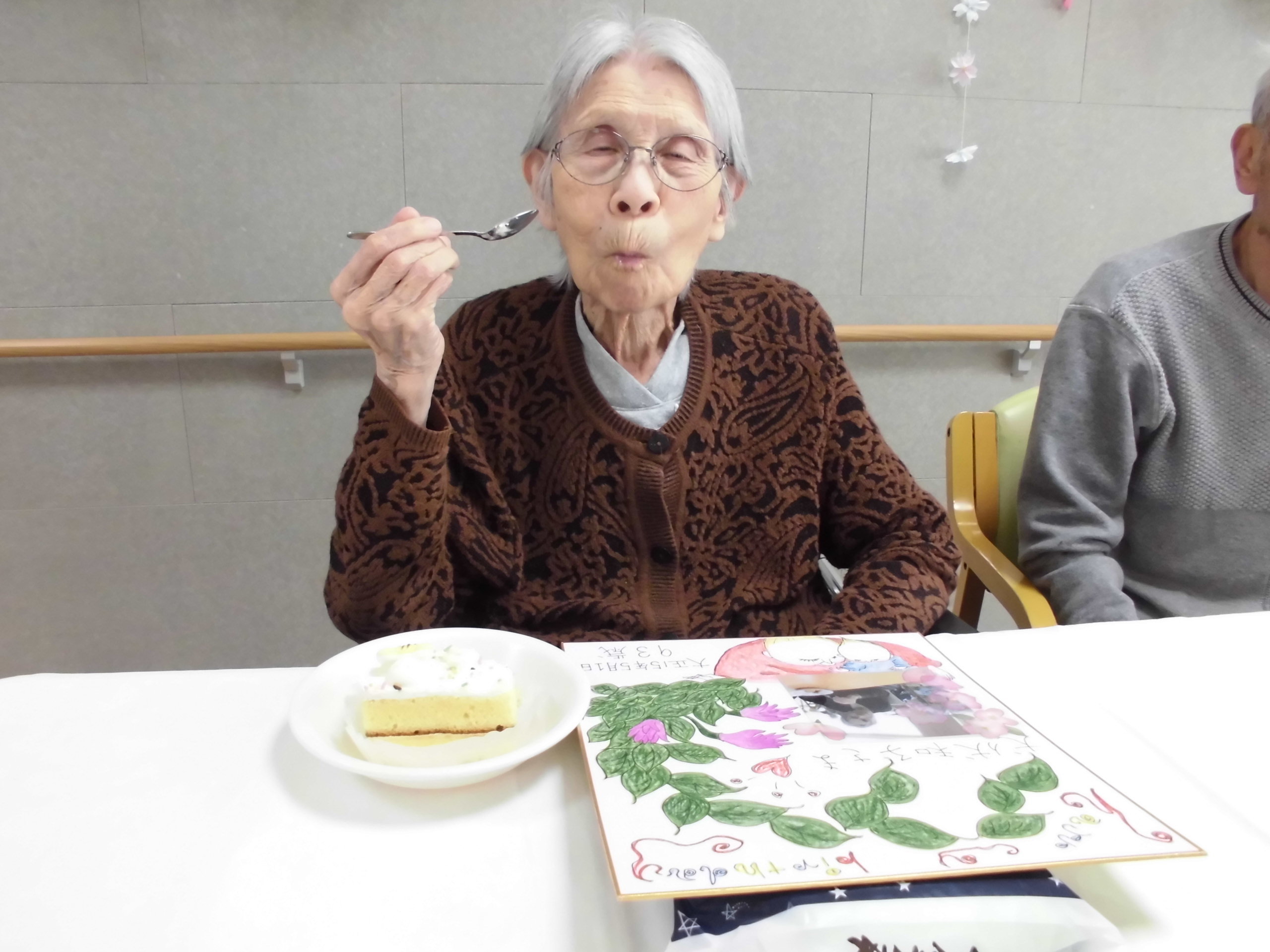 お祝いをさせて頂く際スタッフとご入居者の方と一緒に歌とお祝いの言葉とプレゼントをお渡しさせて頂き最後にケーキを召し上がって頂きました。