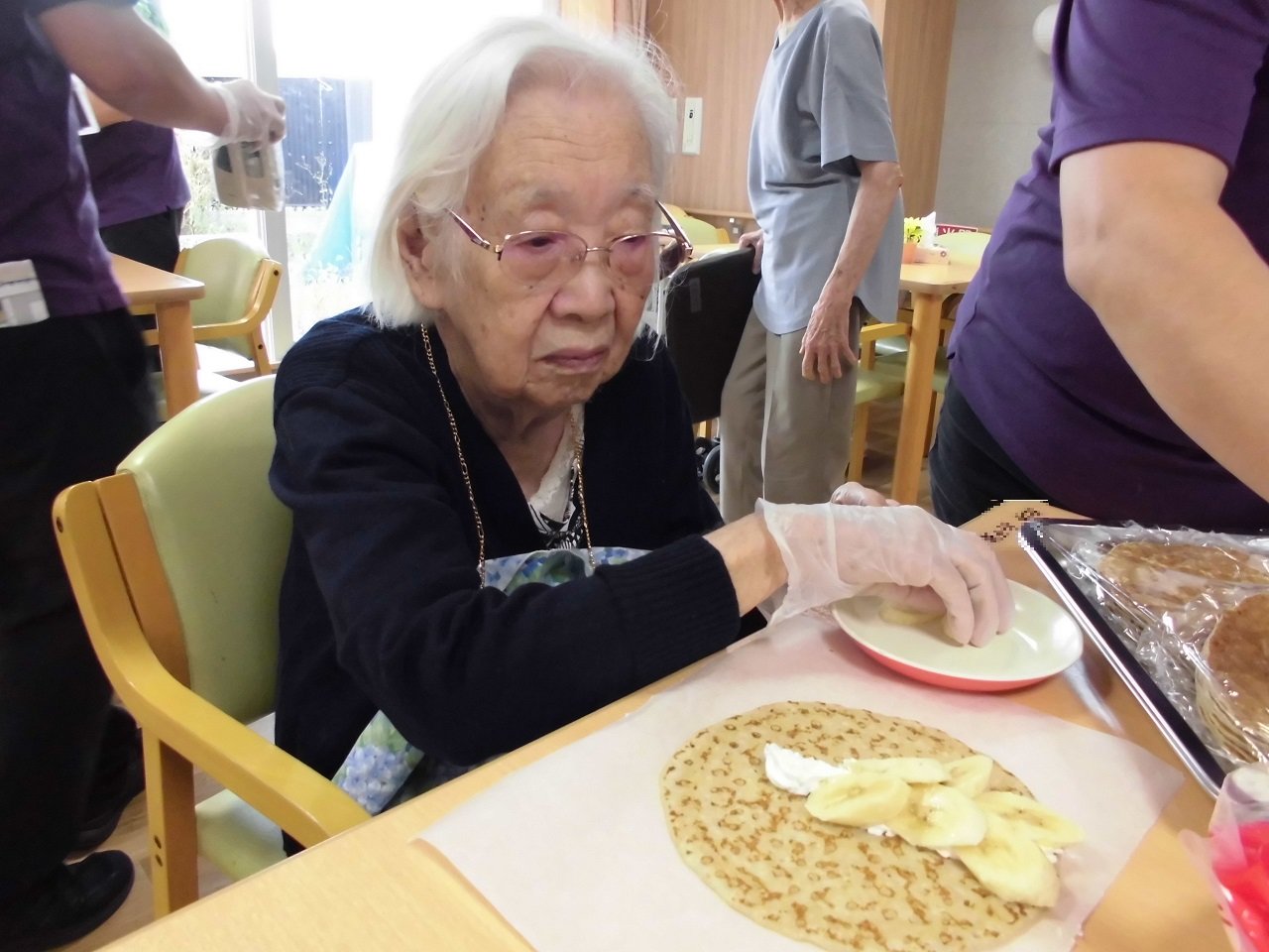 クレープの上にご入居者と一緒にクリームやバナナを乗せていきます