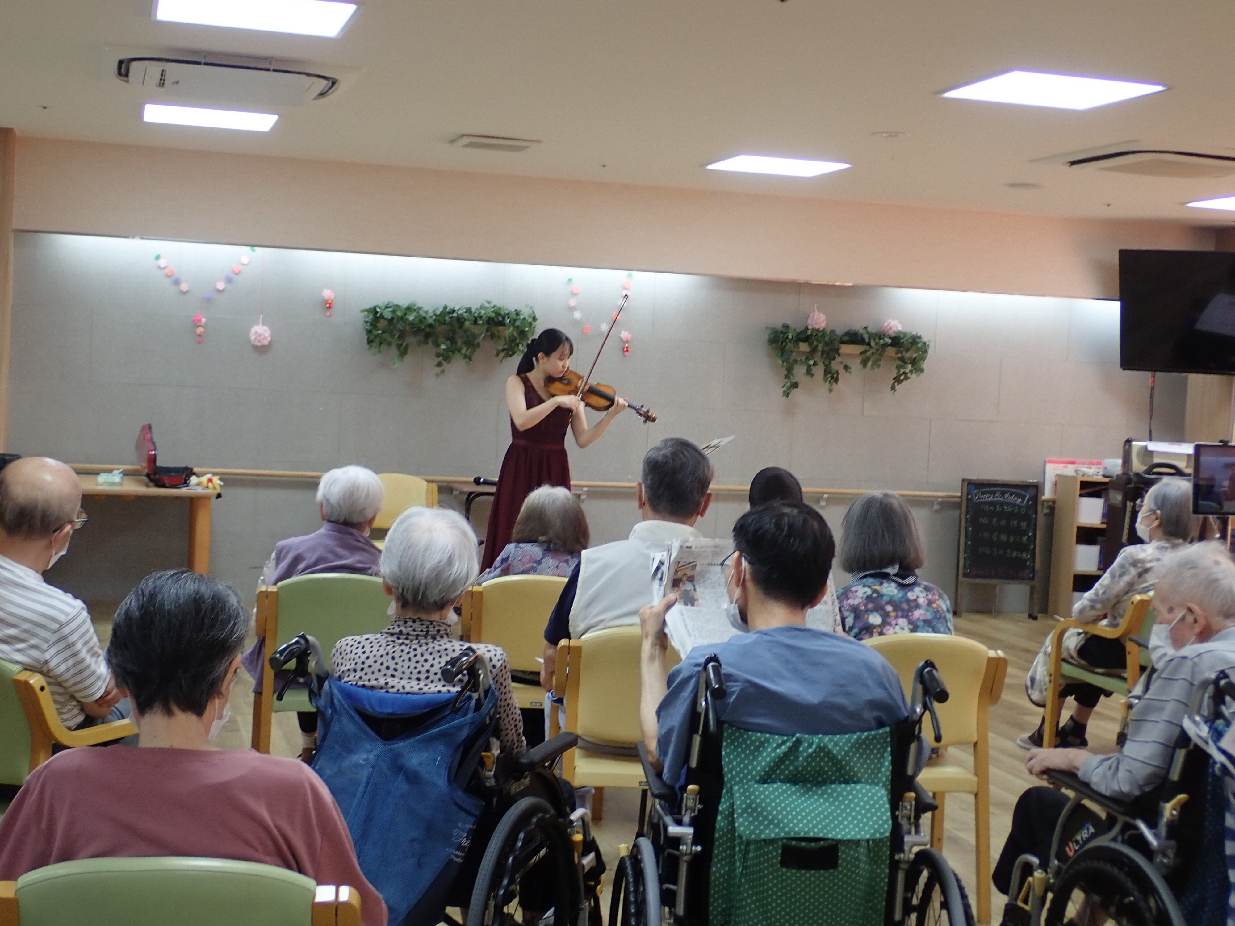 今回のプログラムは、ヴァイオリンで聞き覚えのある人も多い『情熱大陸』の様な有名な曲や『川の流れの様に』といったご入居者の方々が聞きなじみのある曲などで構成されていました!