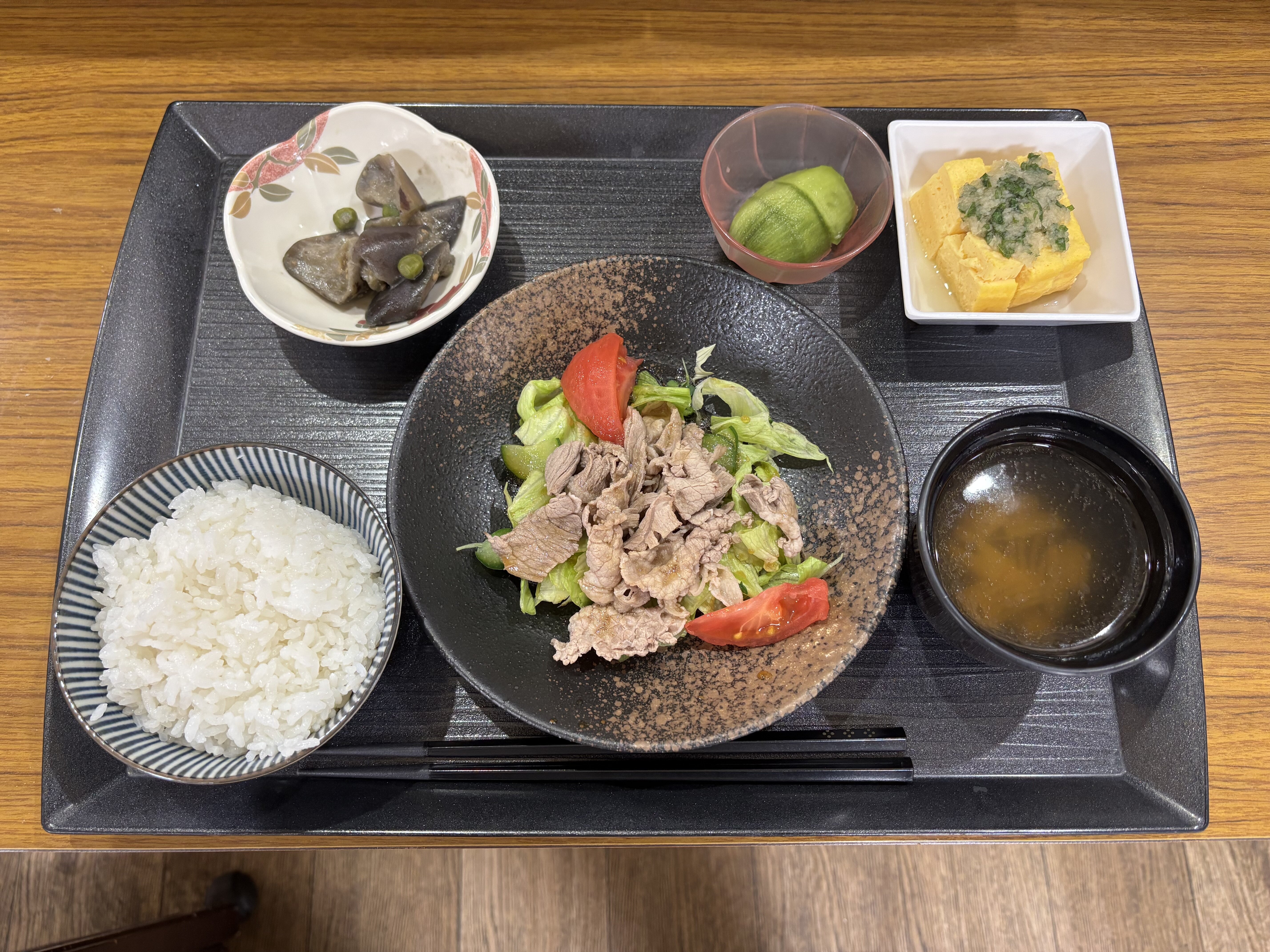 牛しゃぶ、茄子味噌炒め、だし巻き卵、和風スープ、キウイ