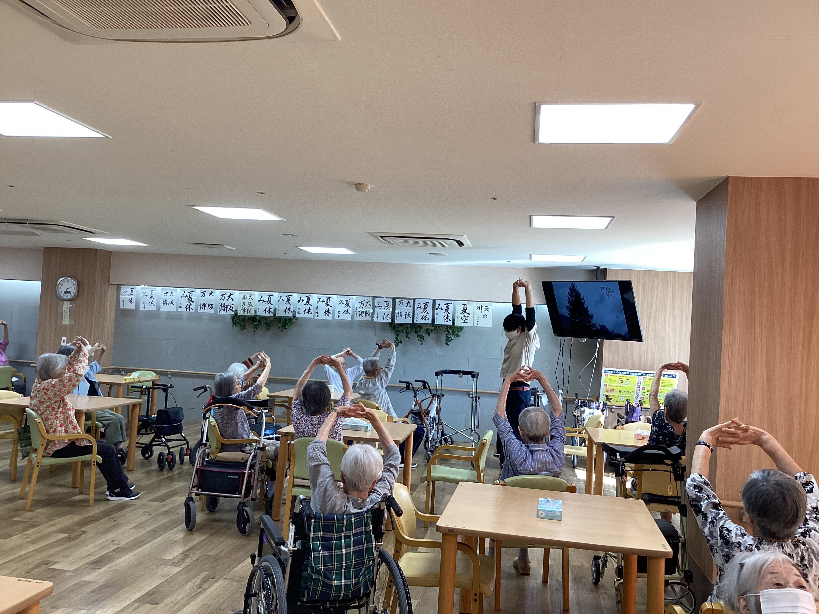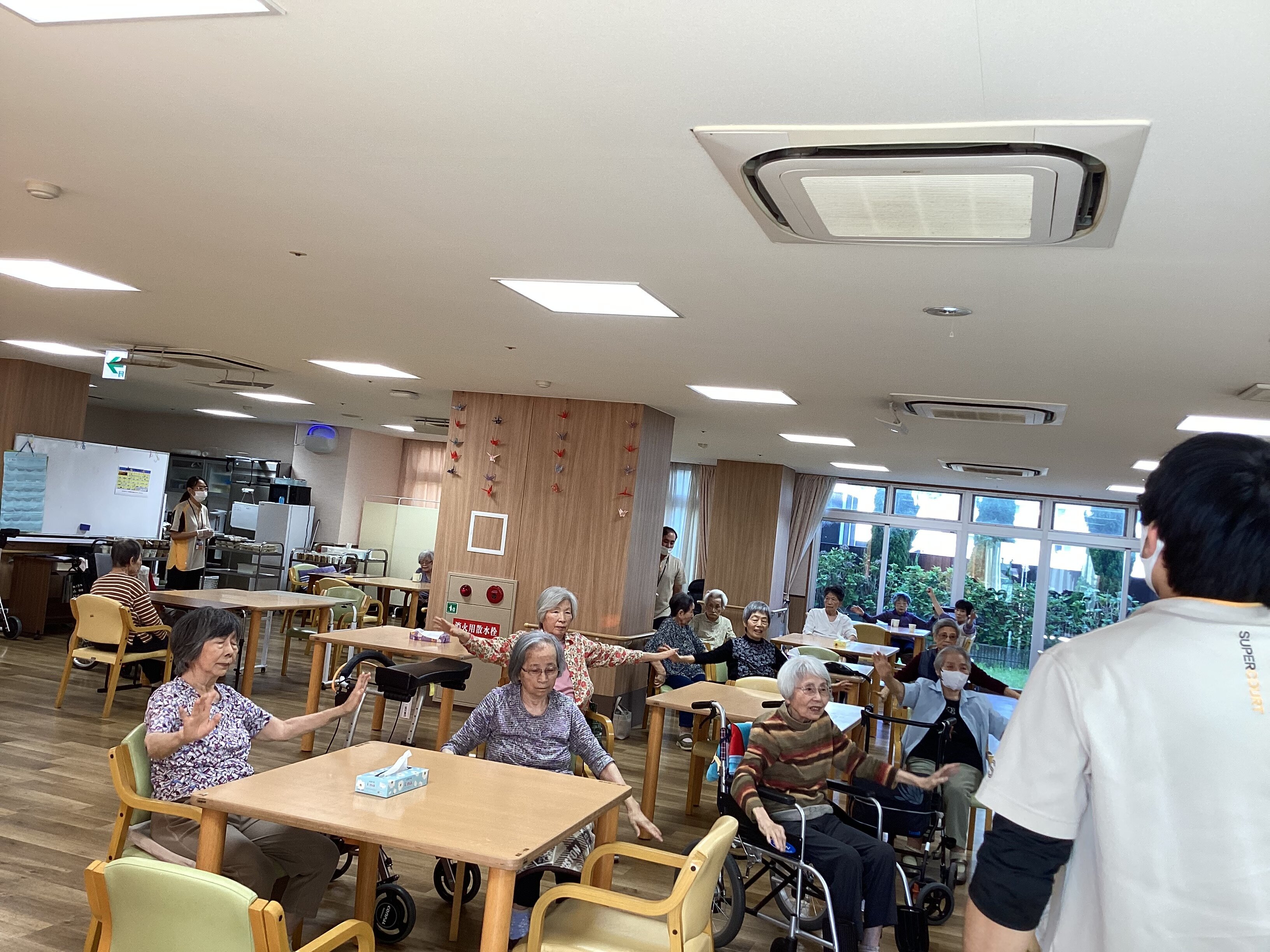 皆さんスーパー・コート茨木彩都です。 いつもブログをご覧になって下さりありがとうございます。今回紹介させて頂くのは日々レクの 体操 です!! ではその様子をお伝えします。 皆さん、「楽しい!」と仰っていました。 写真も撮らせて頂きました!皆さんいい笑顔です!