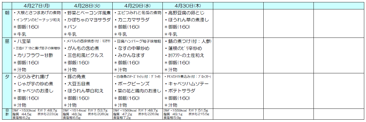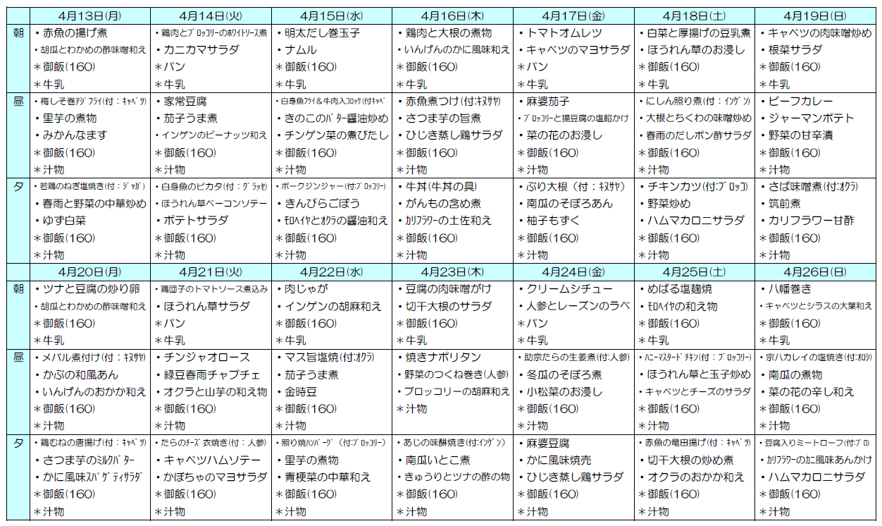 ※朝食にはご飯かパン、昼夕食にはご飯とみそ汁が付きます。