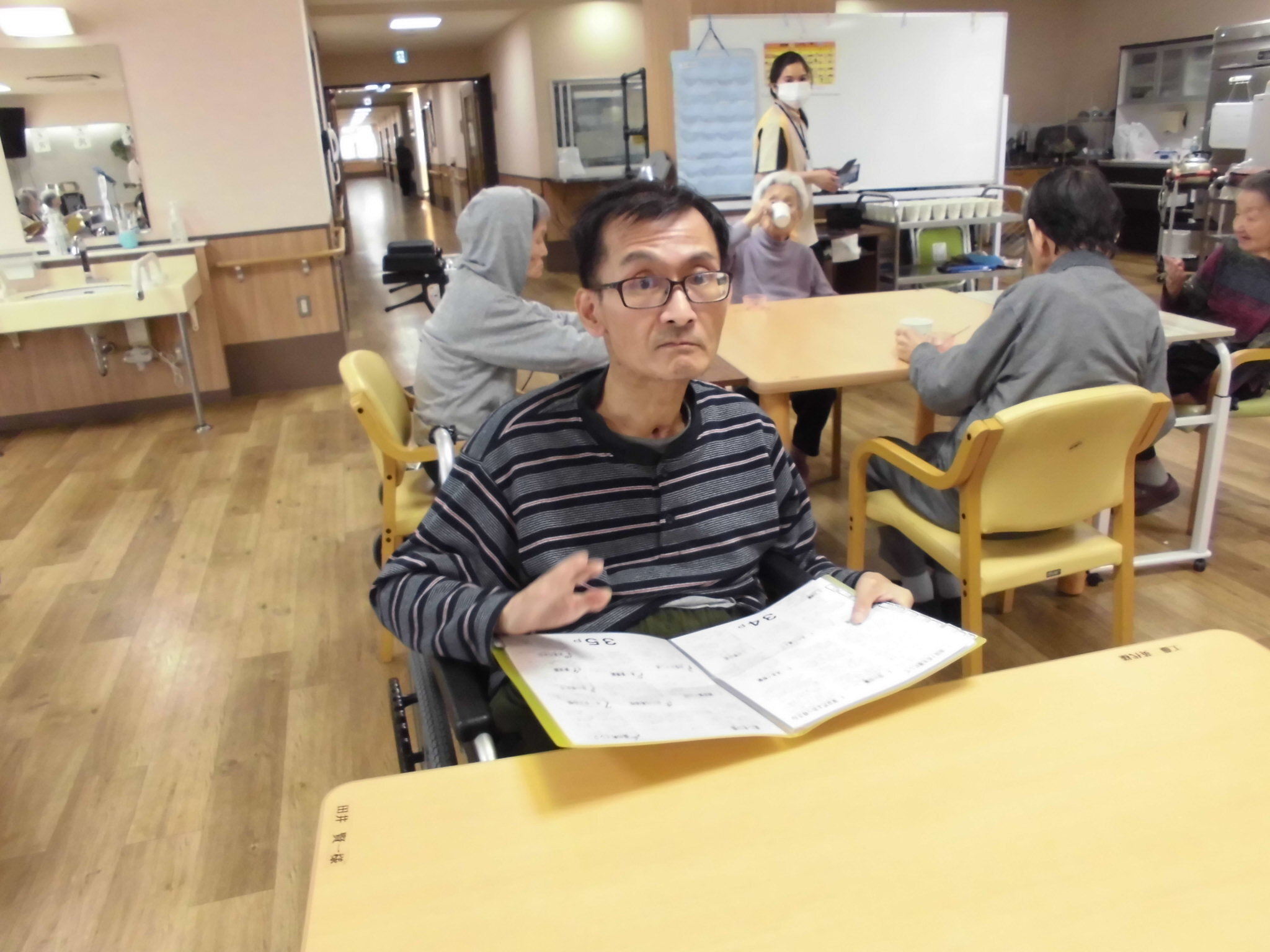 本日のレクリエーションは、脳トレです。ご入居者の皆様真剣に頭を使って回答されていました。