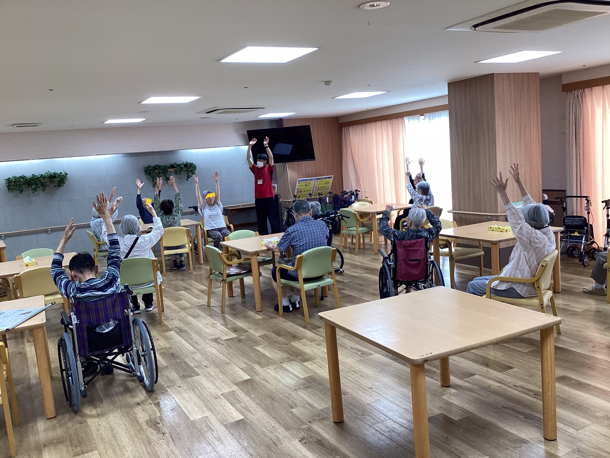 今回は毎週水曜日、お昼のレクリエーションで行っている体操レクのようすをお伝えします!