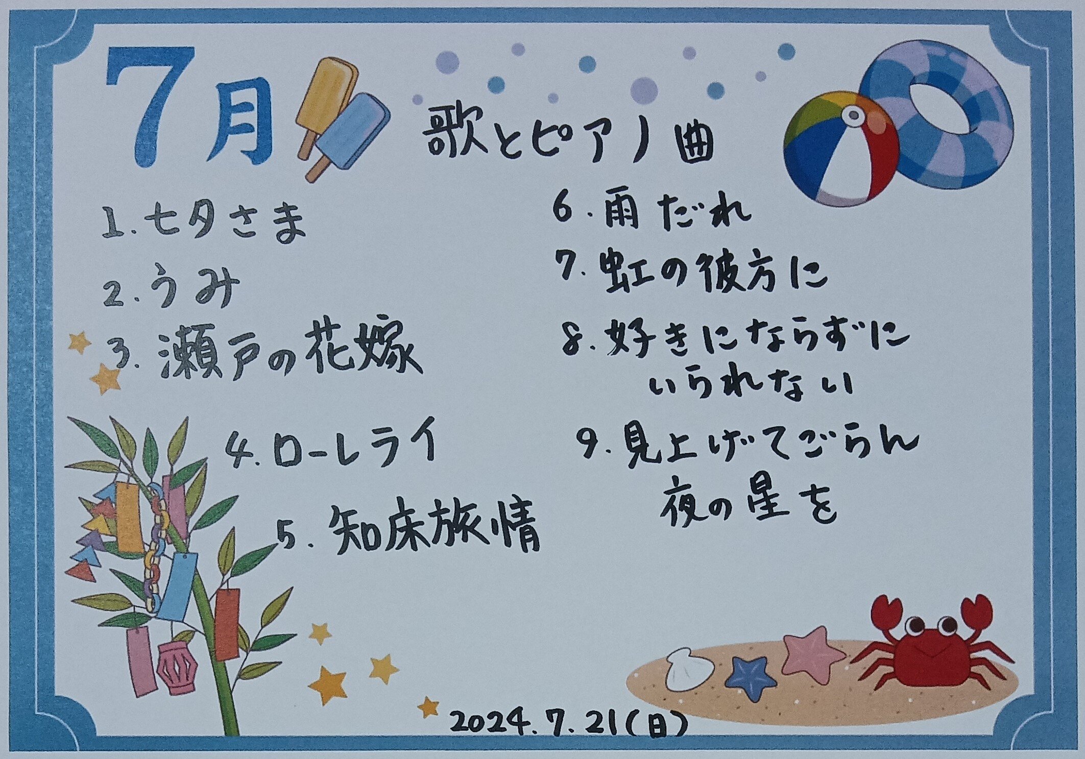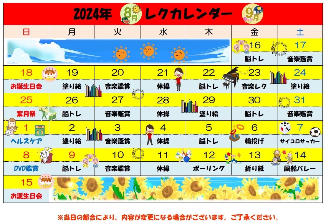8月、9月はお誕生日会が2回、月祭『流しそうめん』、生演奏による音楽レクとたくさんのイベントが続きます!
