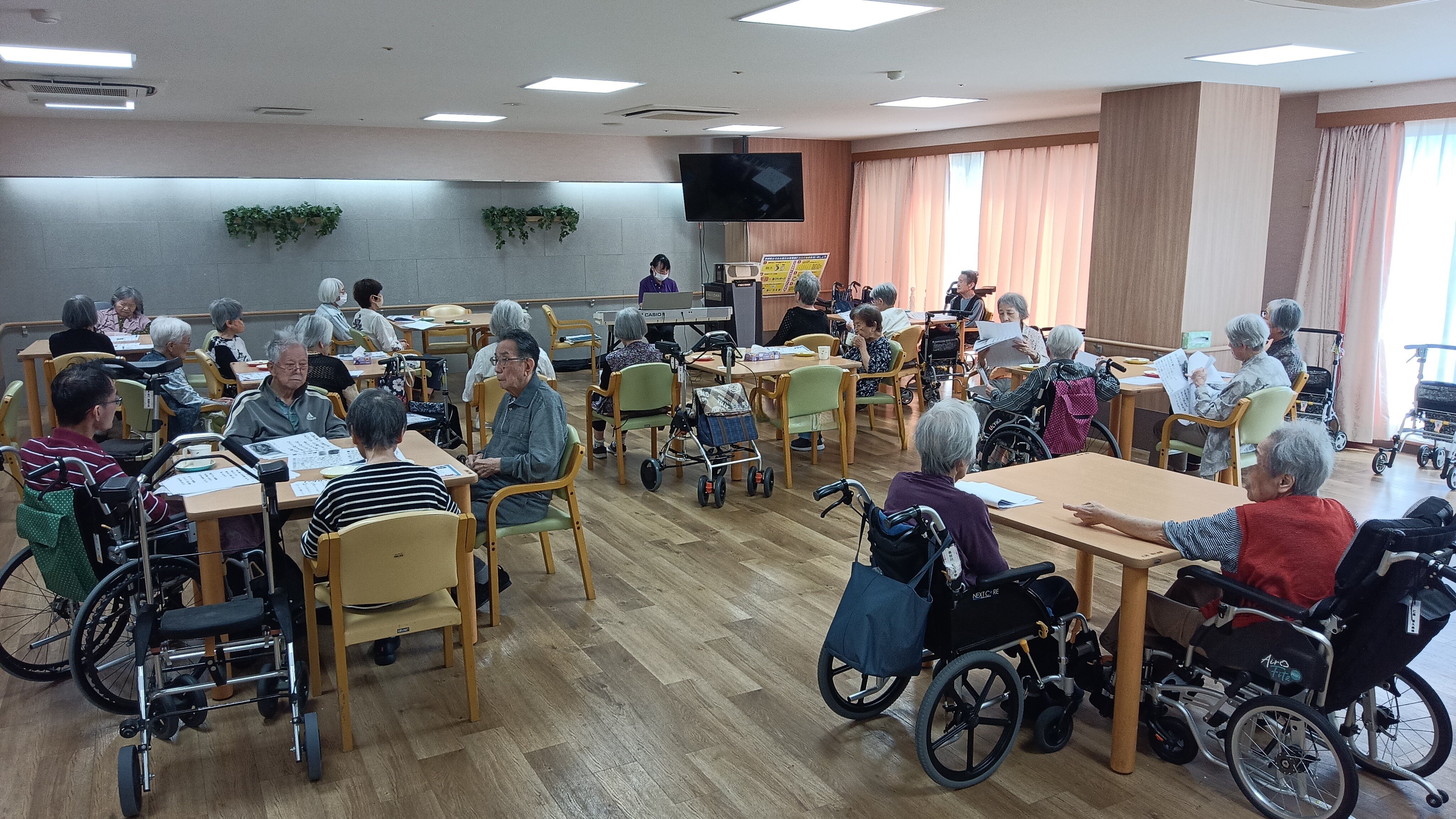 ピアノの演奏や歌詞カード、プログラムの作成は施設職員が行なっています。