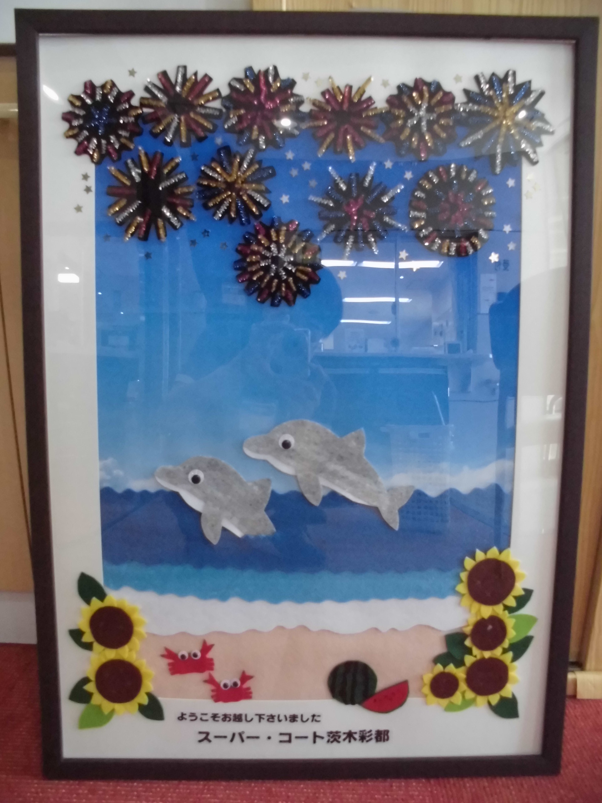 8月のウェルカムボードにはイルカに海と、とても夏らしくかわいいものになっています!