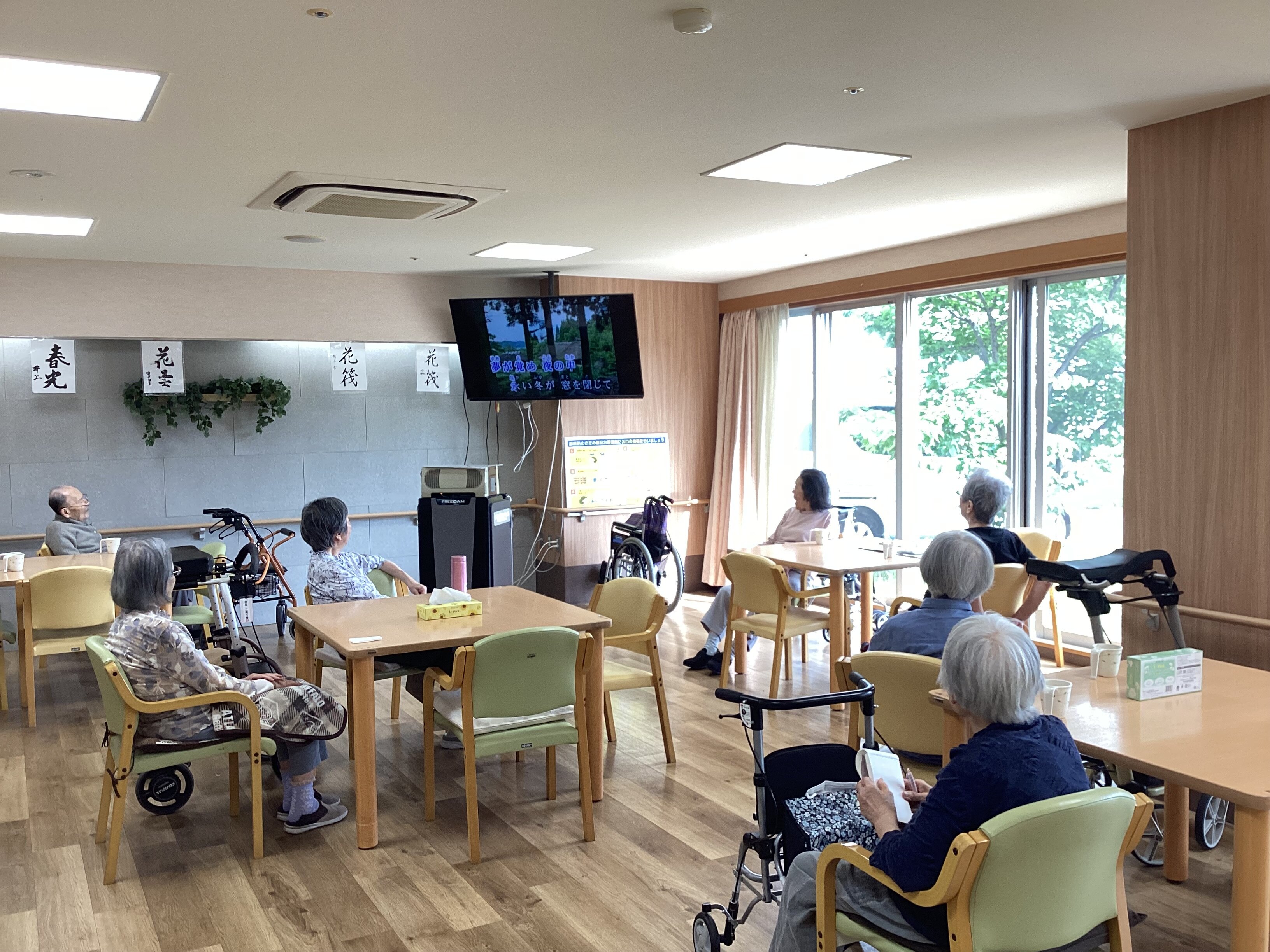 音楽鑑賞のレクリエーションは、人気のレクの5位以内に入っています。ご入居者の皆様、懐かしい歌謡曲の、音楽鑑賞をされていました。