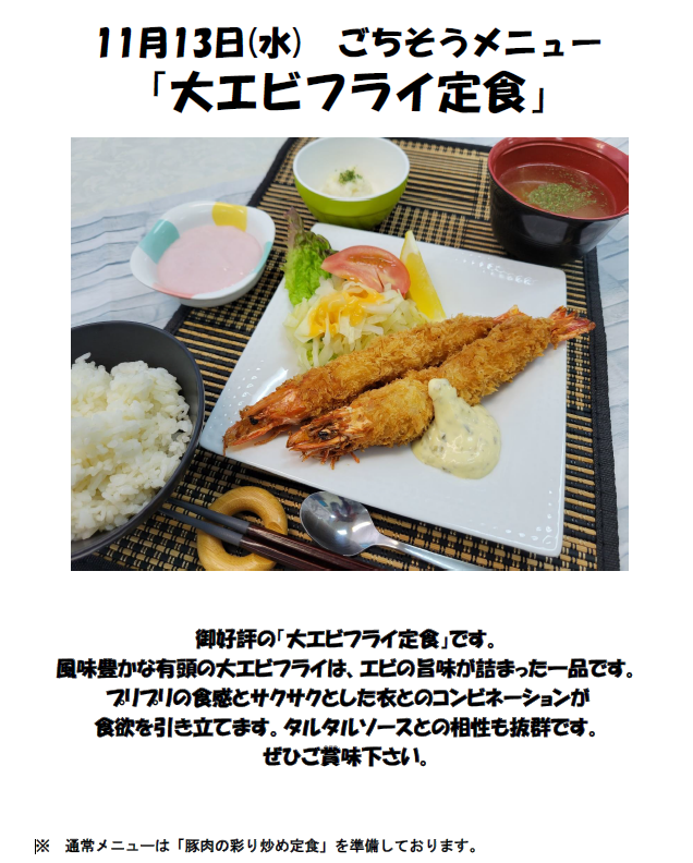 今週のおすすめは【ごちそうメニュー 大エビフライ定食】です!!