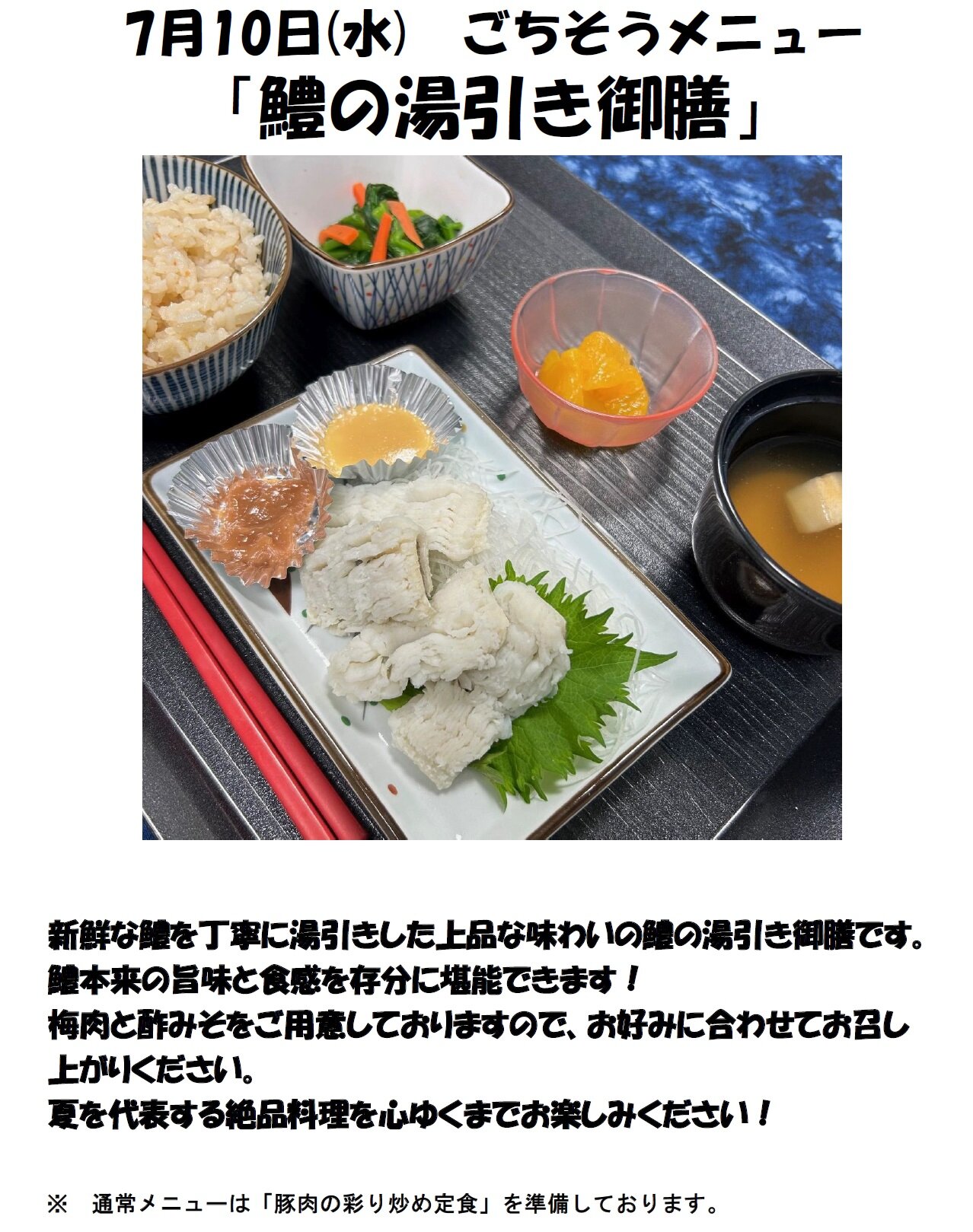 今週のおすすめは【七夕祭りメニュー】と【ごちそうメニュー 鱧の湯引き御前】です!!