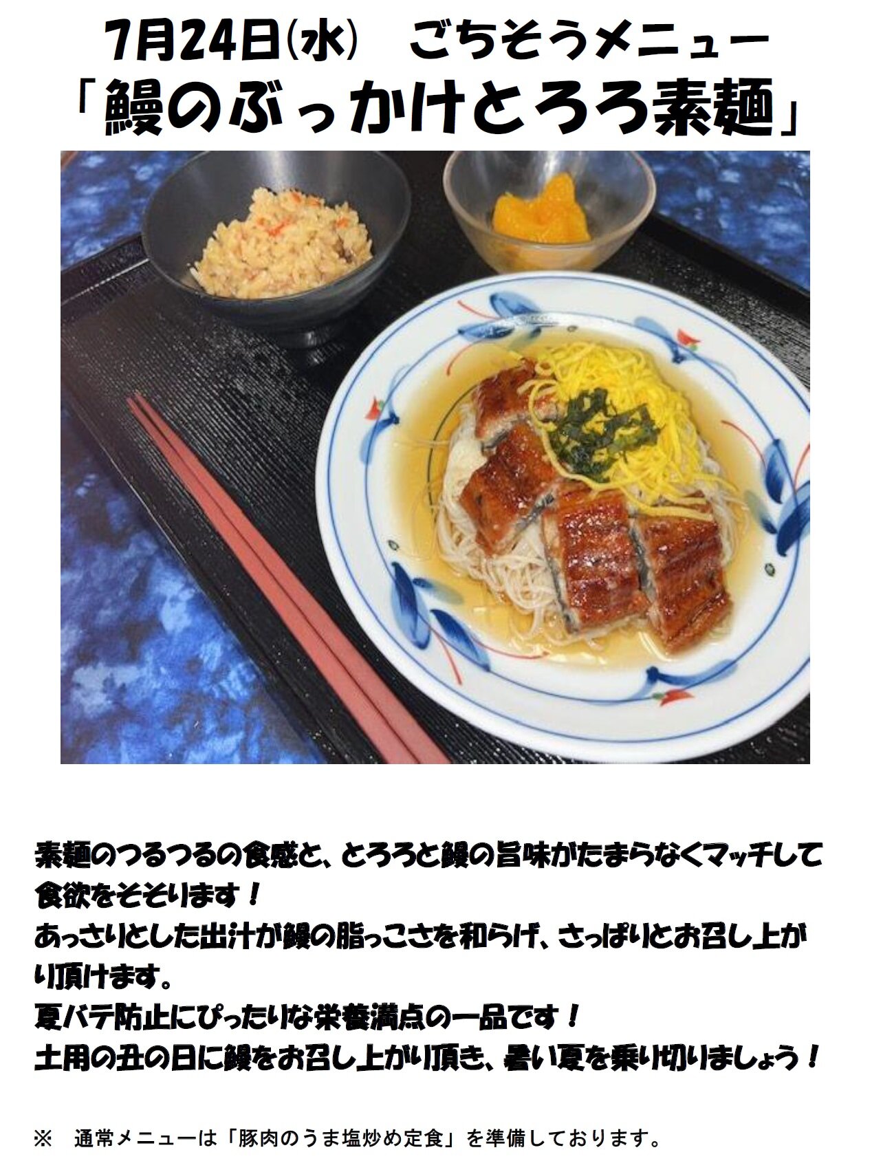 今週のおすすめは【ごちそうメニュー 鰻のぶっかけとろろ素麺】です!!