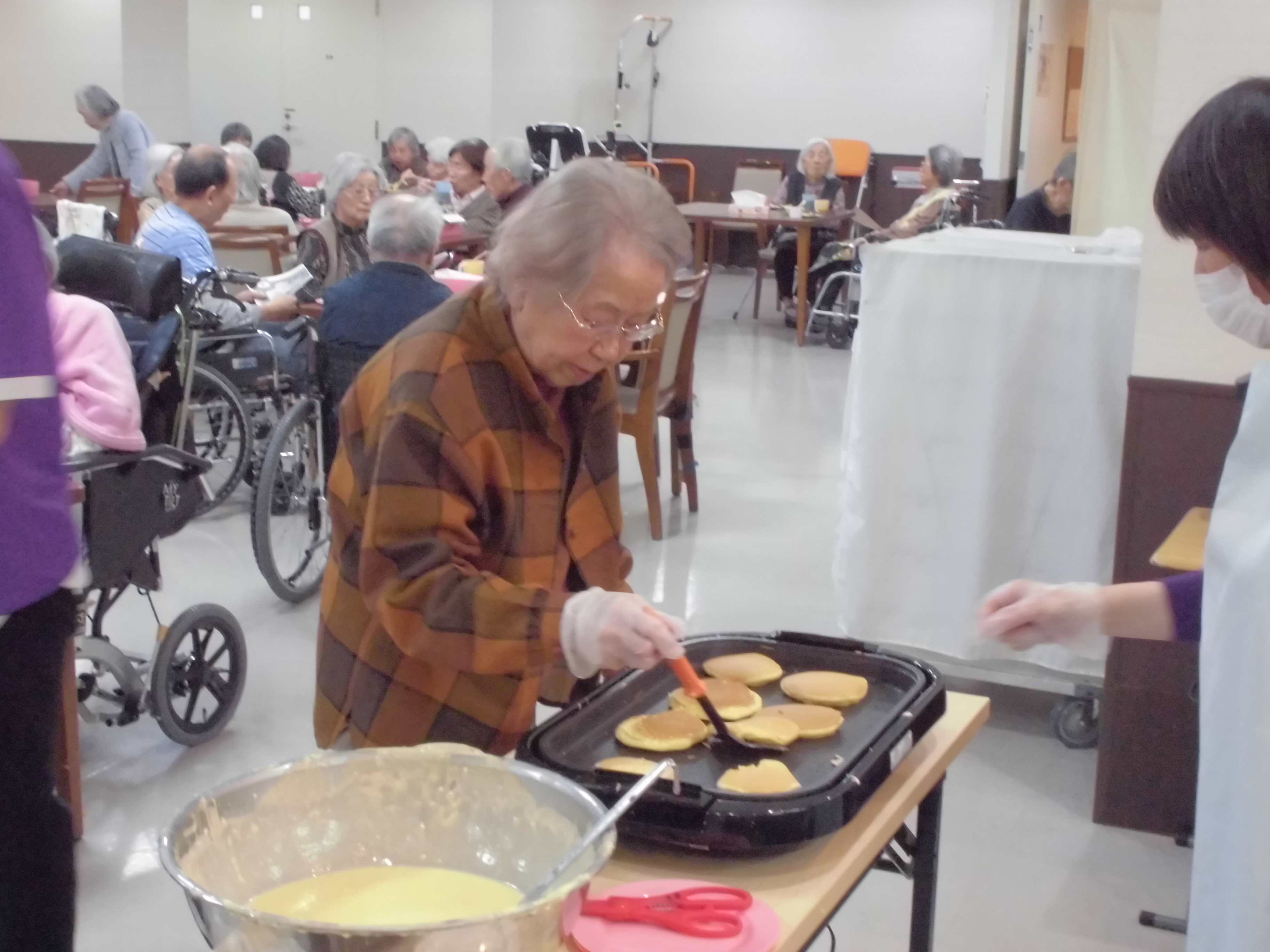 4月のレクリエーションの一環として『みんなでパンケーキ』を行いました。生地作りからホットプレートを使ってみなで焼き、シロップや生クリーム、果物をトッピングしておいしく食べました。
