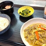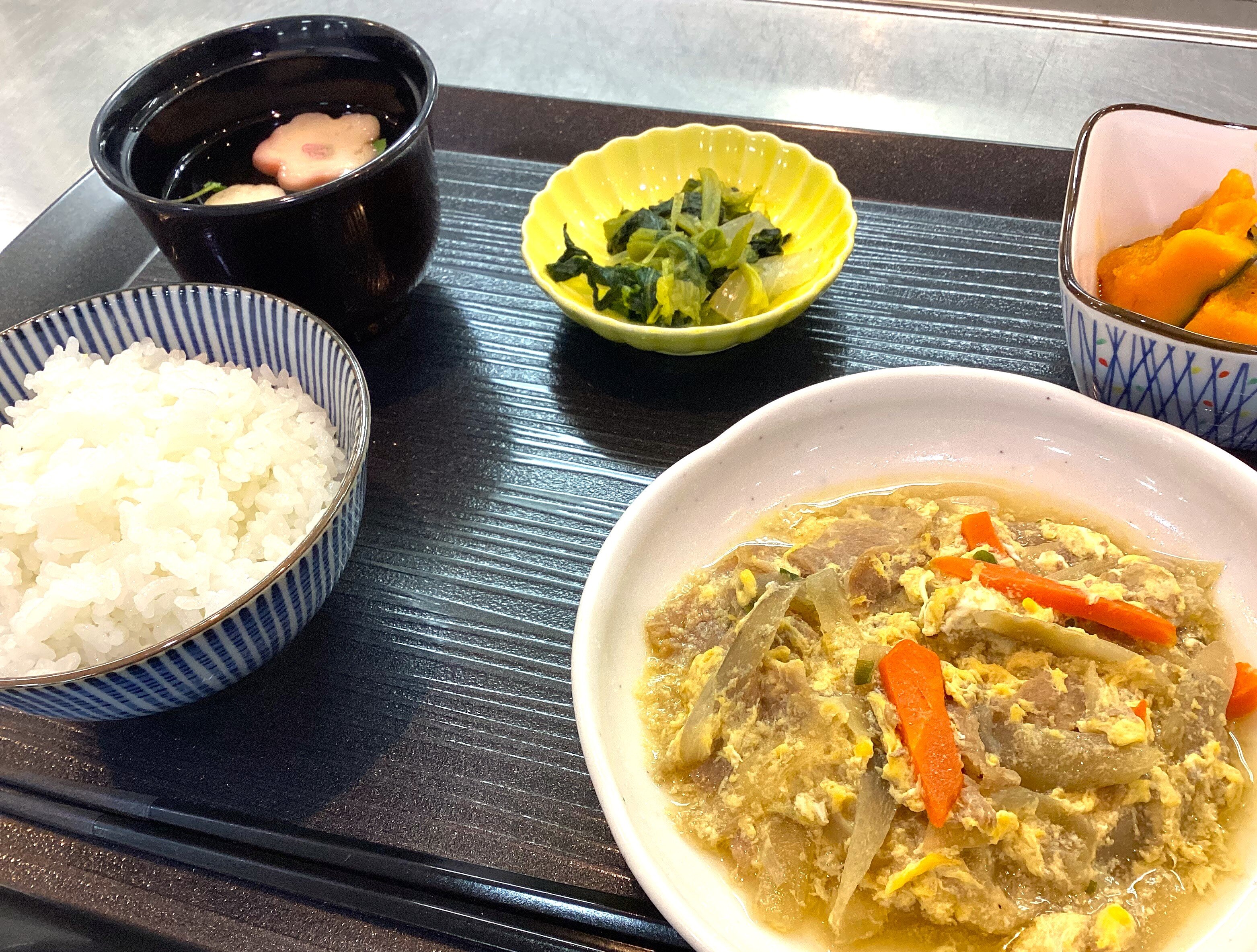 本日のメニューは柳川風と南京の煮物、小松菜のドレ和え、すまし汁です!