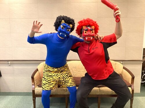 会場となる食堂には二つの大きな円を作り、皆さまにグルっと座っていただきました。そこへ元気な鬼に扮したスタッフが勢いよく登場です!