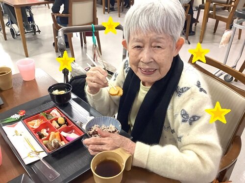 お一人おひとりのペースで、ゆっくりとお正月料理を堪能されていました。 お箸を手に「美味しいよ」と微笑んでくださる姿に、私たちスタッフも元旦から たくさんの元気をいただきました。