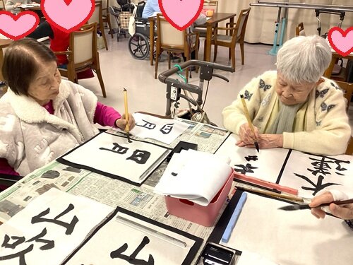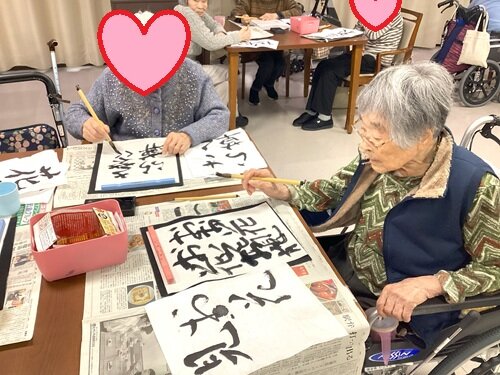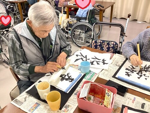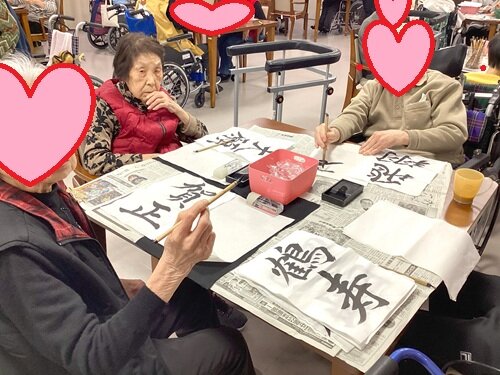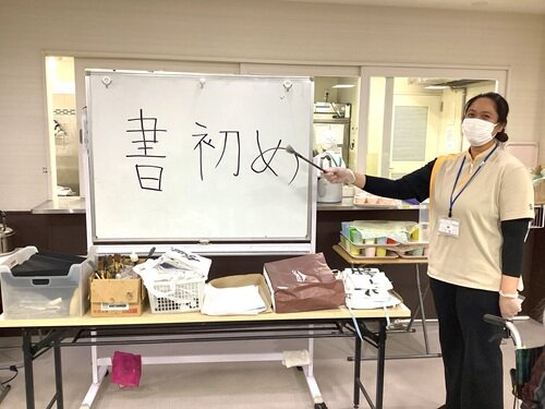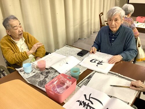 三が日の中日、二日は「書き初め」を行いました。 墨の香りがふんわりと漂う中、皆さま「何を書こうかな」と真剣な表情で半紙に向き合われていました。