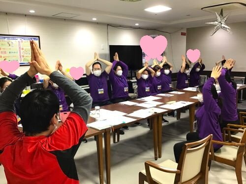 筋を伸ばす柔軟が大事なことを身をもって体験する全体会議でした。
