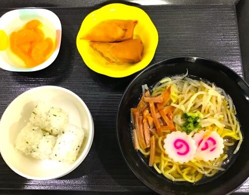 ラーメン、おにぎり、春巻き、そしてデザートはミカン ♪