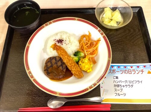 ハンバーグにエビフライ!ちょっとワクワクするビジュアルです♪