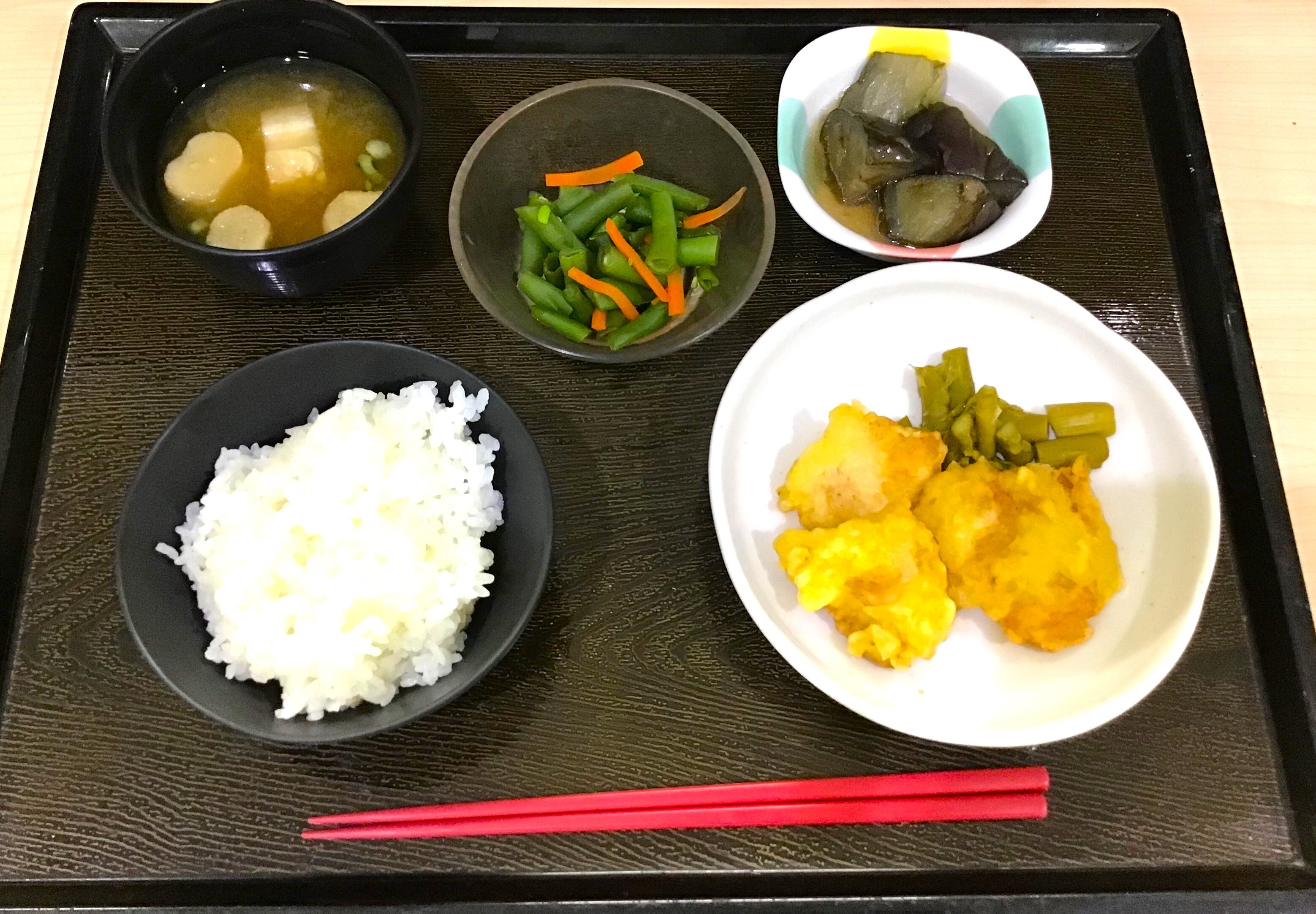 とり天・茄子の煮物・三度豆の和え物・お味噌汁・ご飯です!