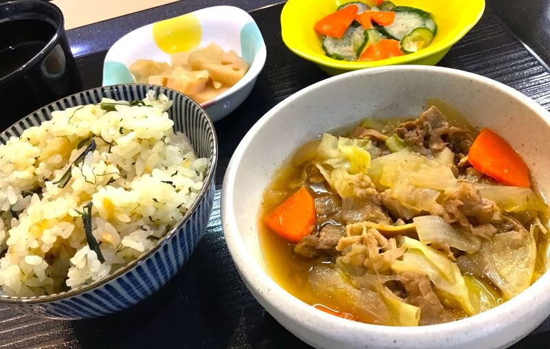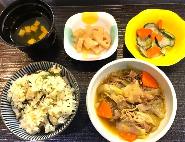本日のメニューは柳川風と南京の煮物、小松菜のドレ和え、すまし汁です!