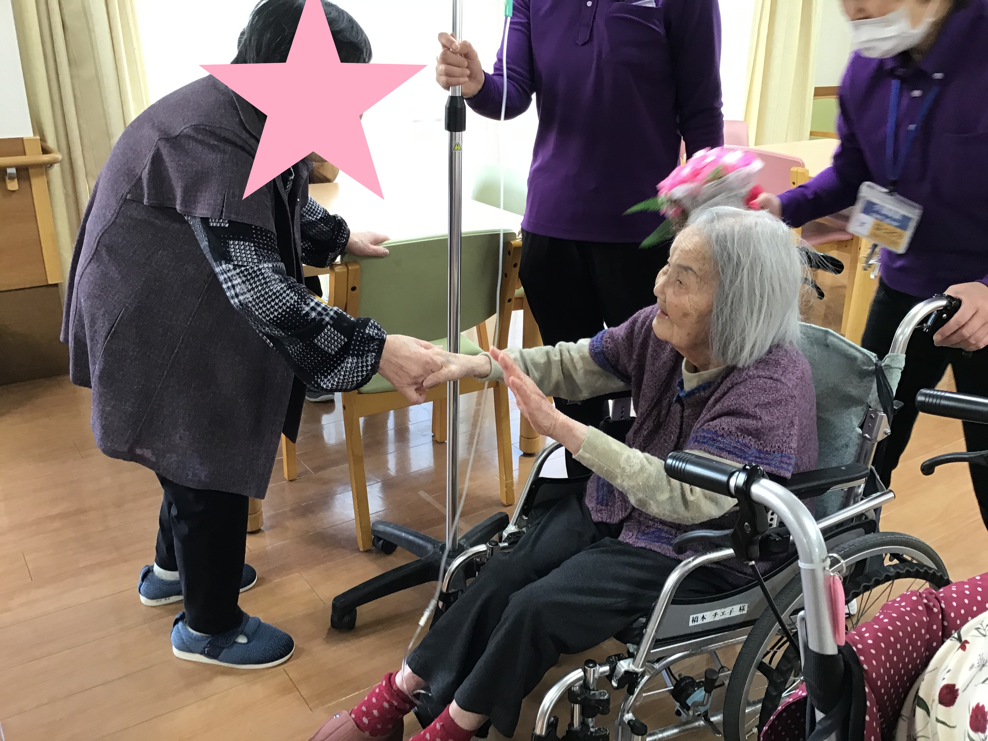 【100寿】ということで「桃色」ちゃんちゃんこを着て頂きました。