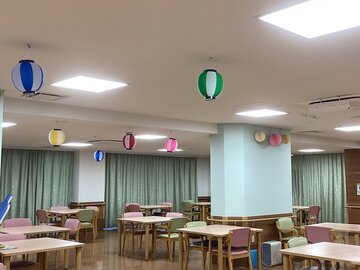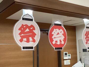 玄関前や食堂も飾りつけされ夏祭り開催に向けて雰囲気が高まってきています୧(⑉•̀ㅁ•́⑉)૭