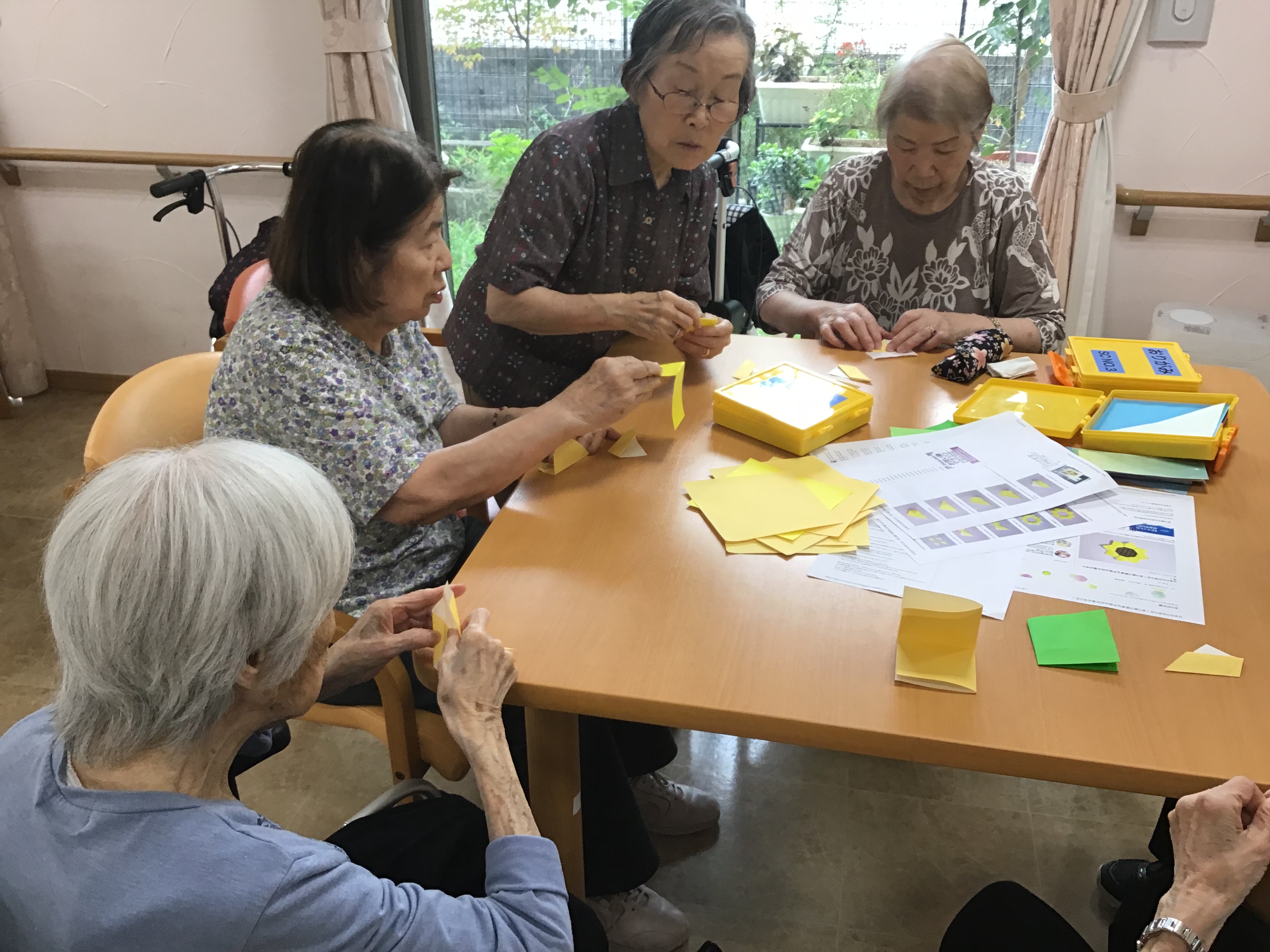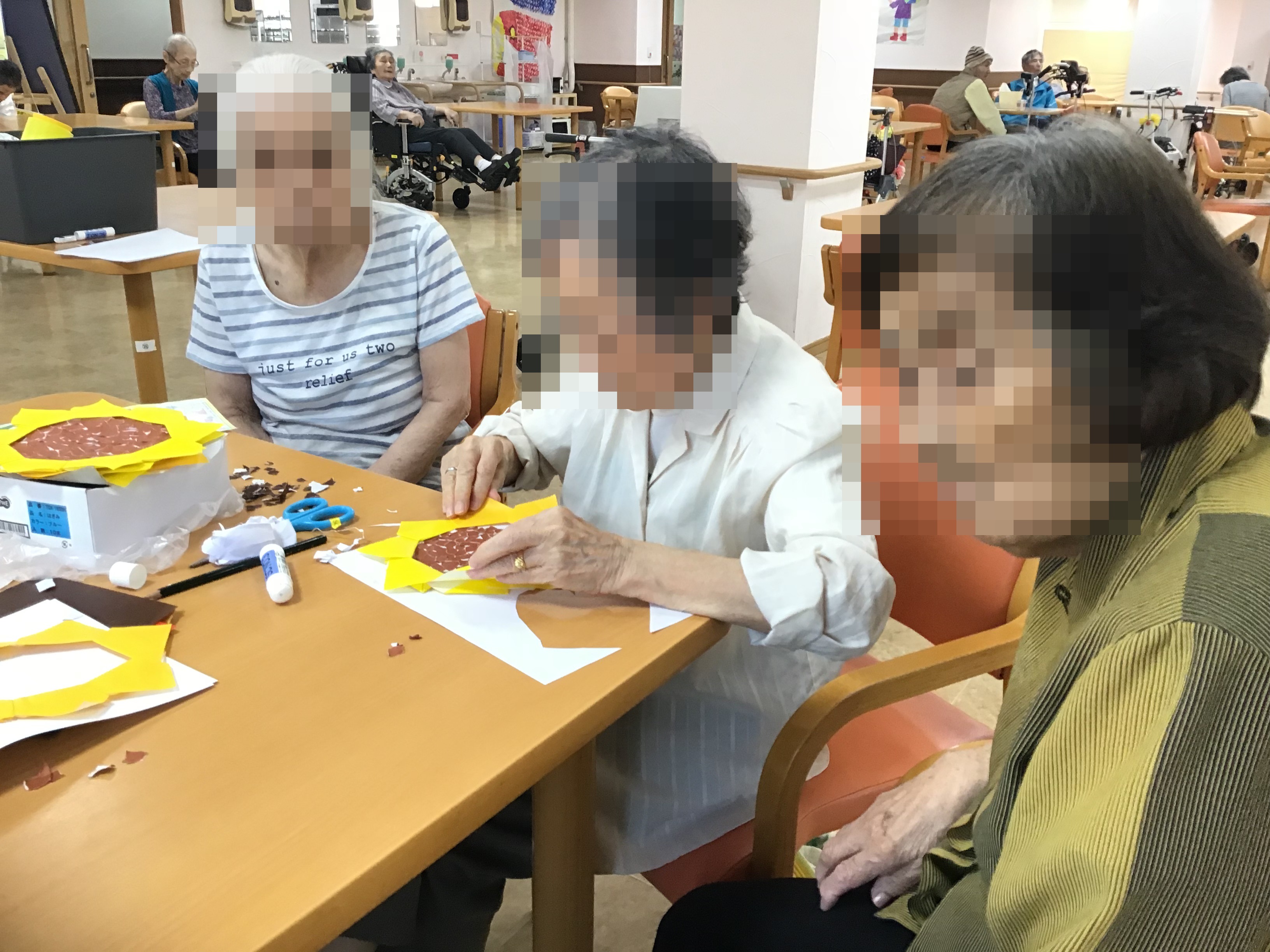 ひまわりは花びらを1枚ずつ折り紙で作り、種の部分はちぎり絵で