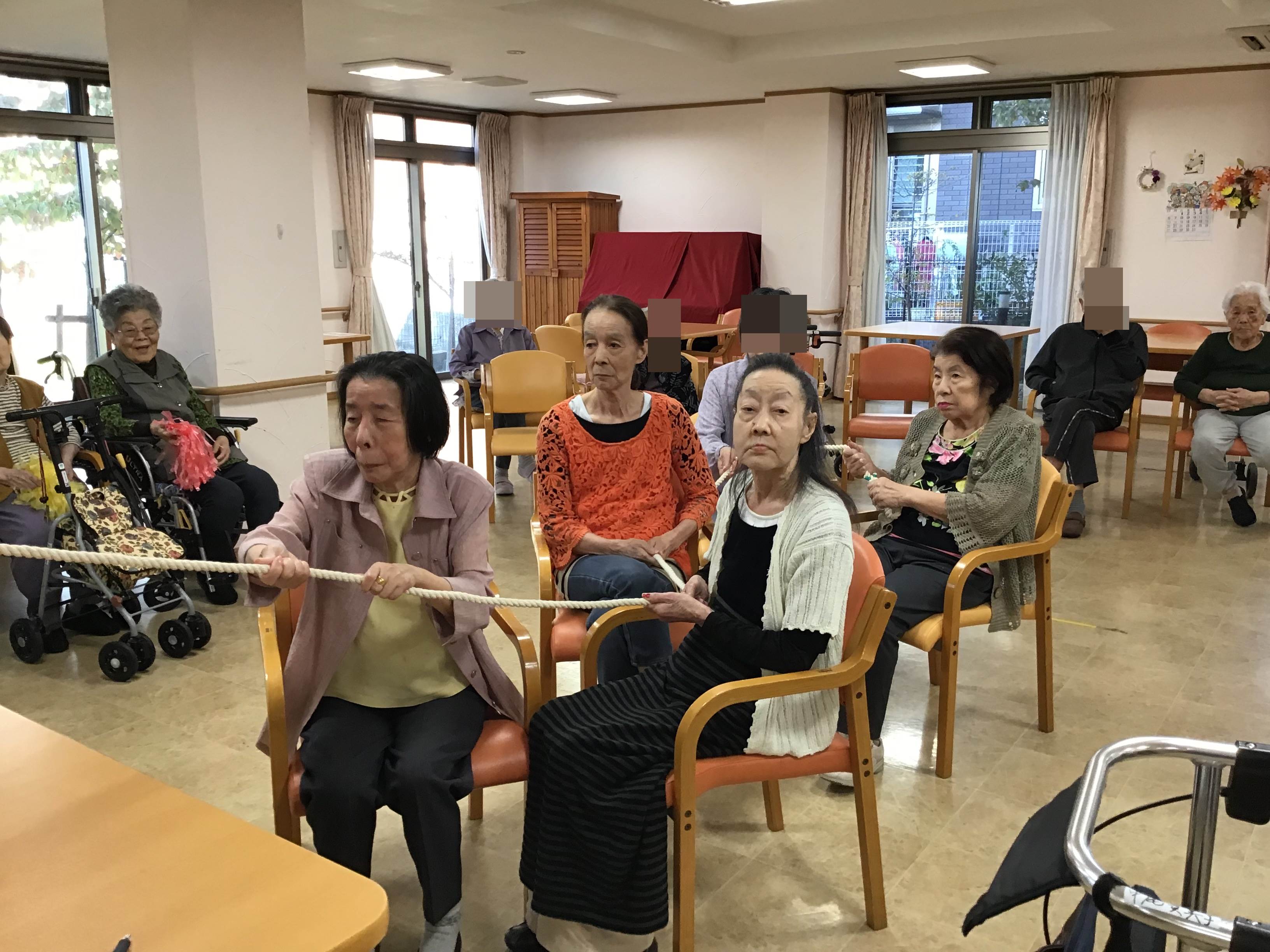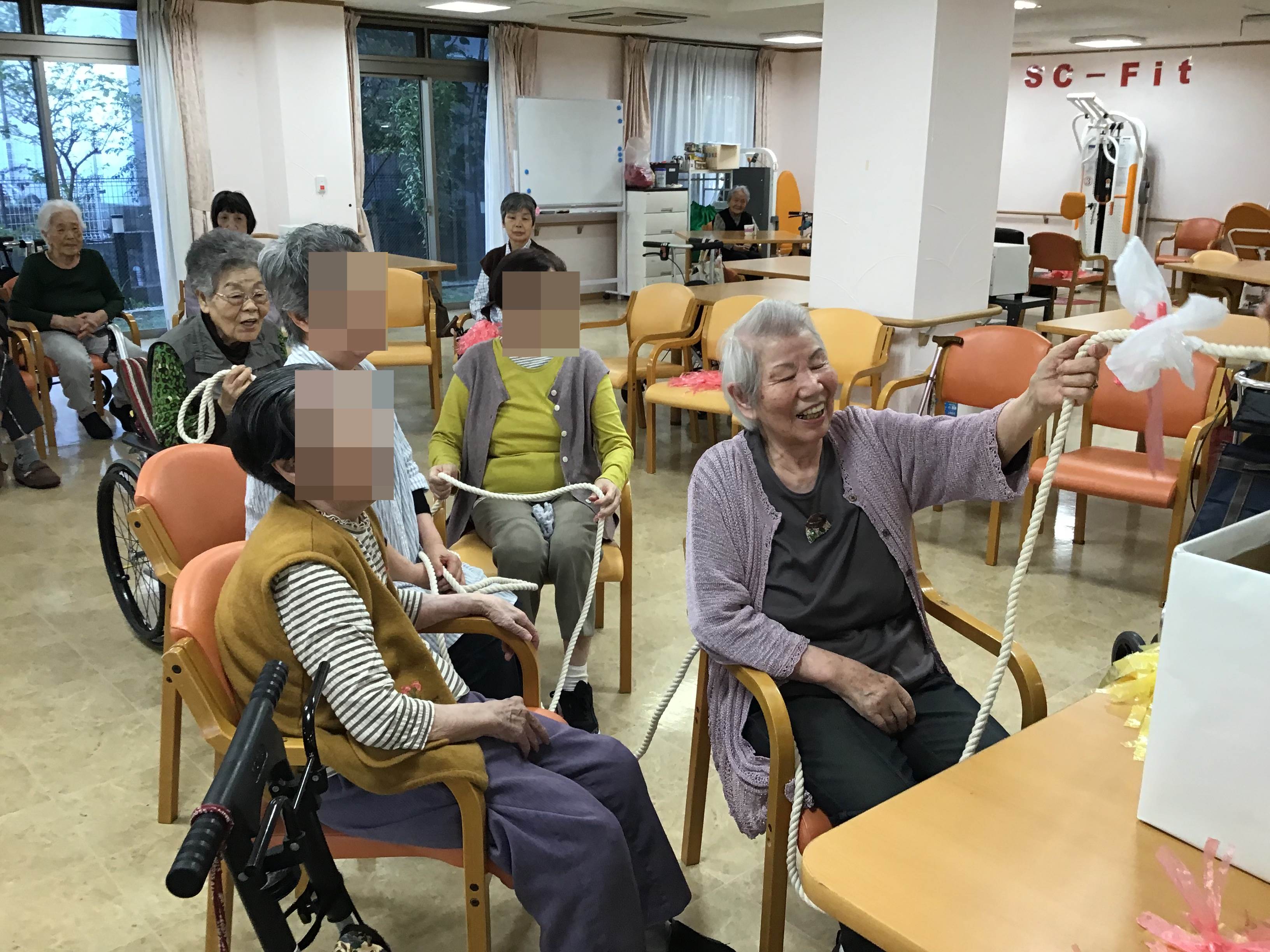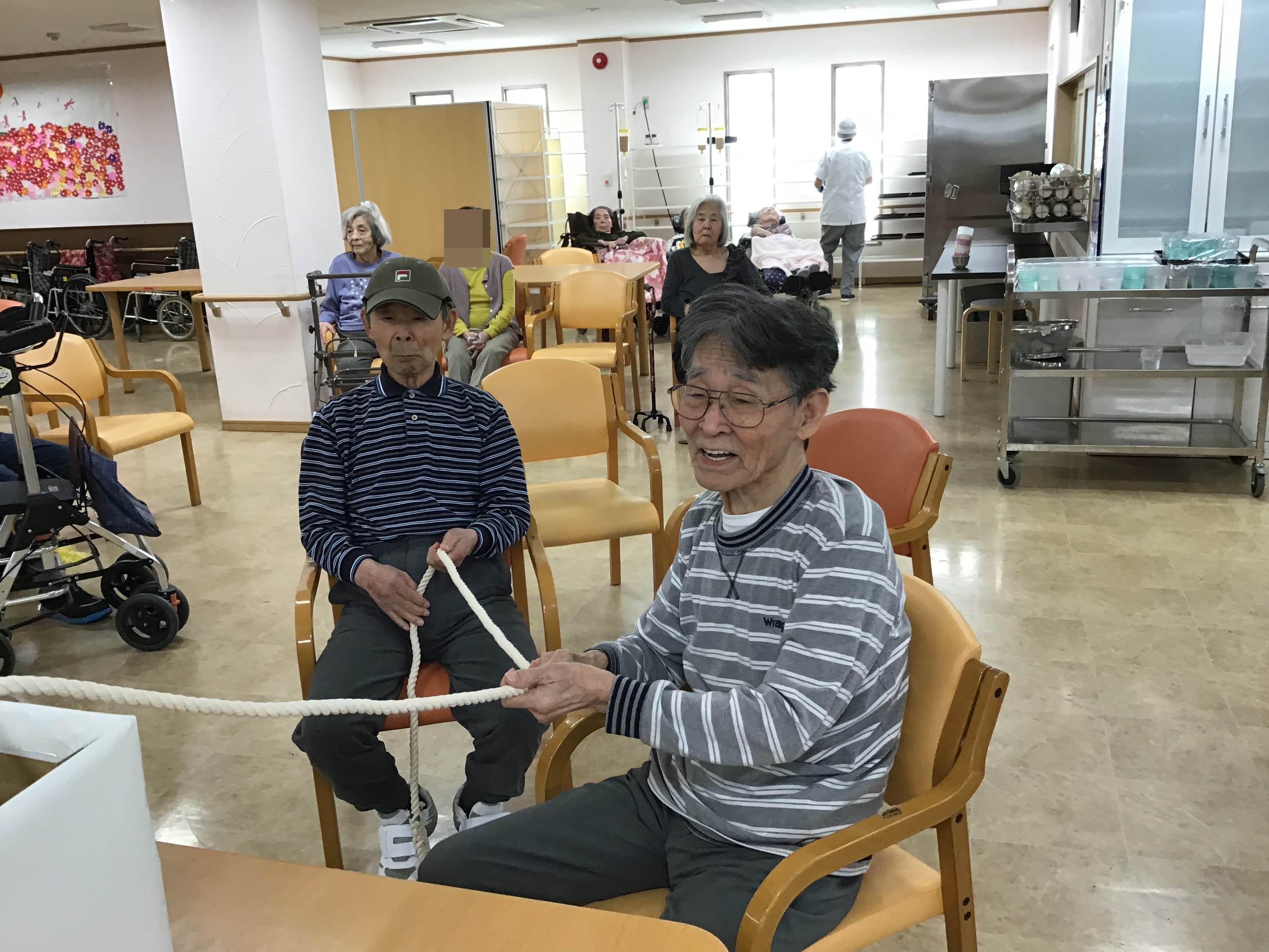 箱に綱をいれ両端を引っ張り、先に真ん中のしるしが出てきたほうが勝ちというルールで行いました!