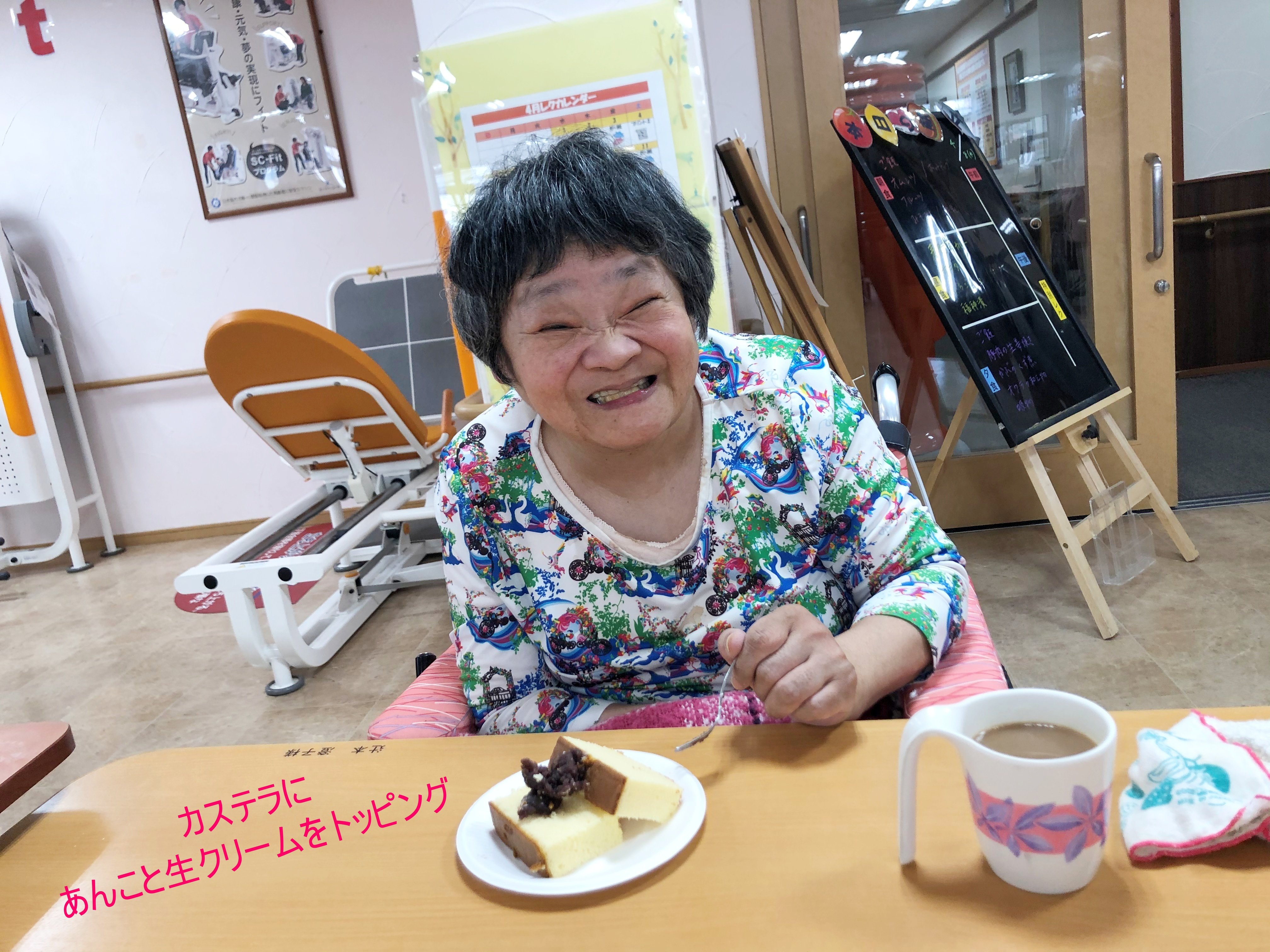今日のおやつはカステラに皆さん大好きあんことホイップクリームのトッピング♪