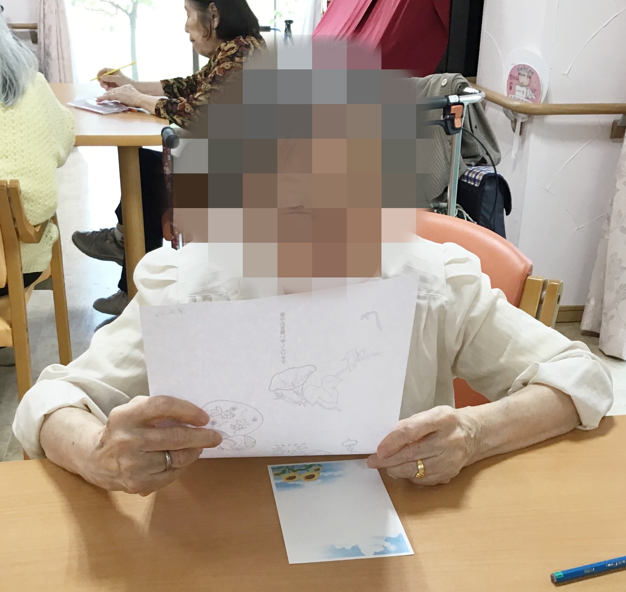 家族様宛に塗り絵や文字を書いて頂き、はがきを作成させて頂きました。