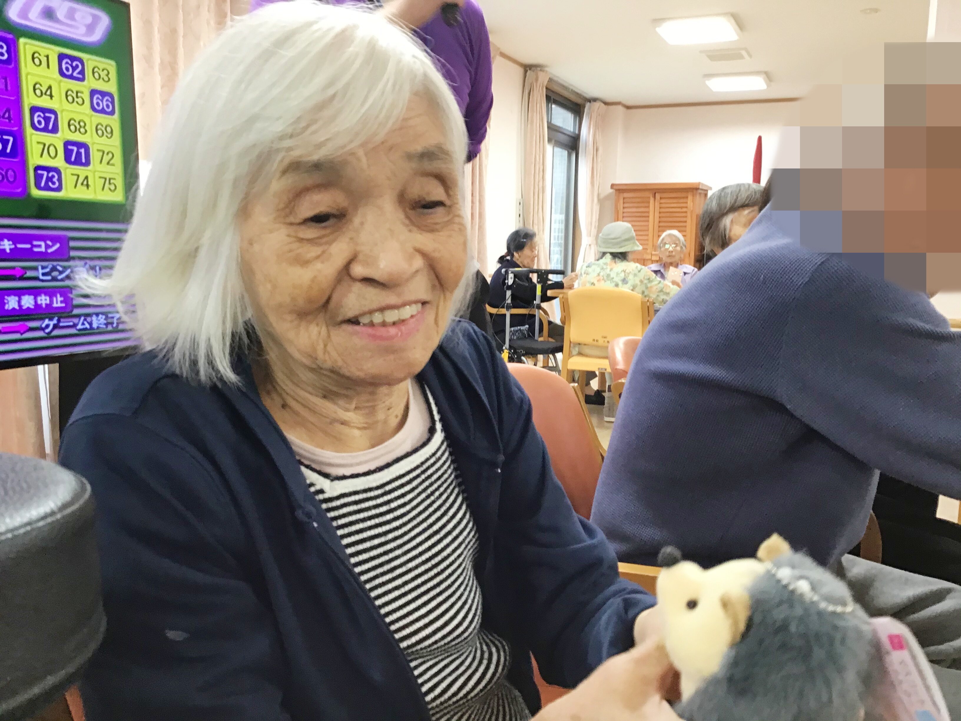 可愛いハリネズミのキーホルダーを手に笑顔♡