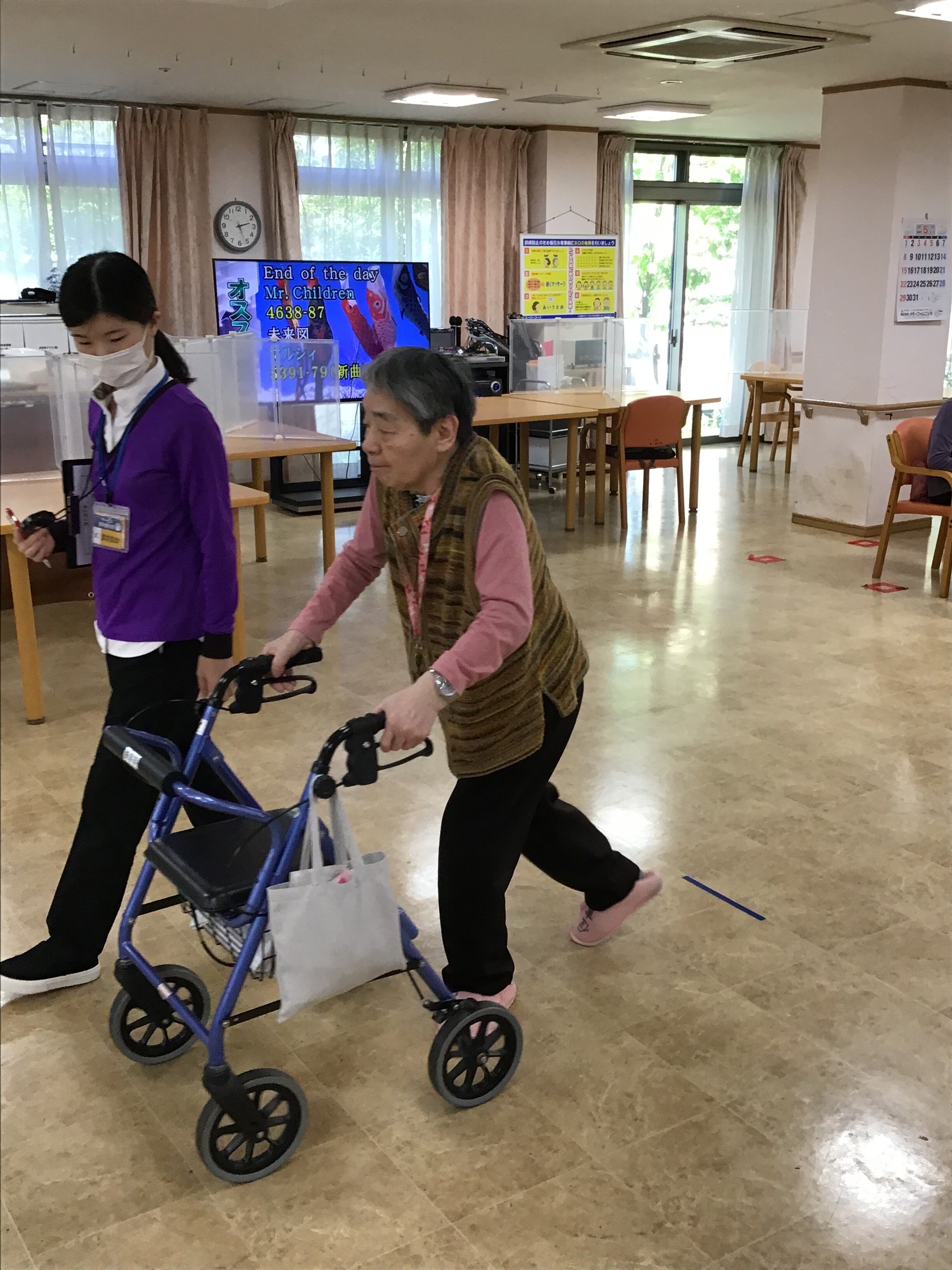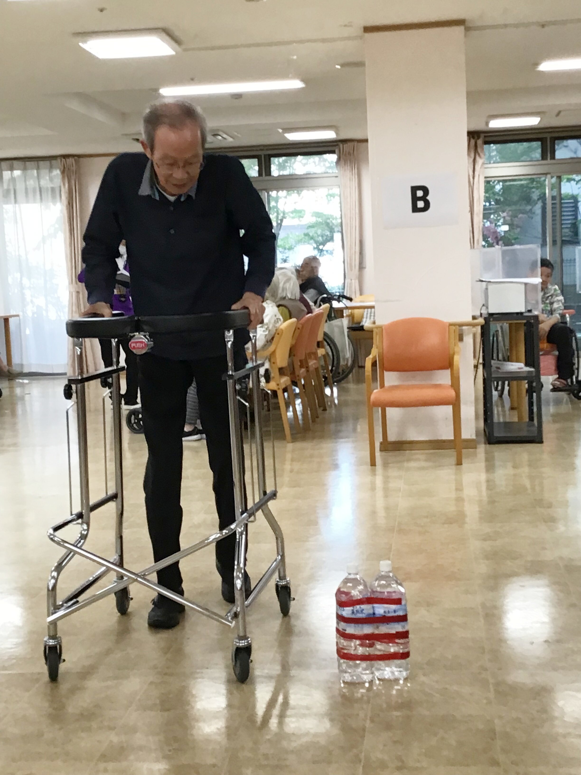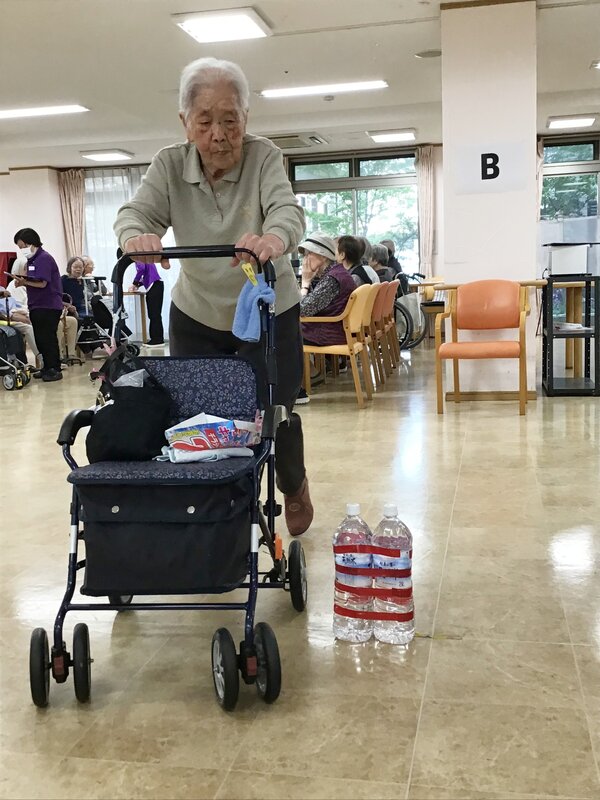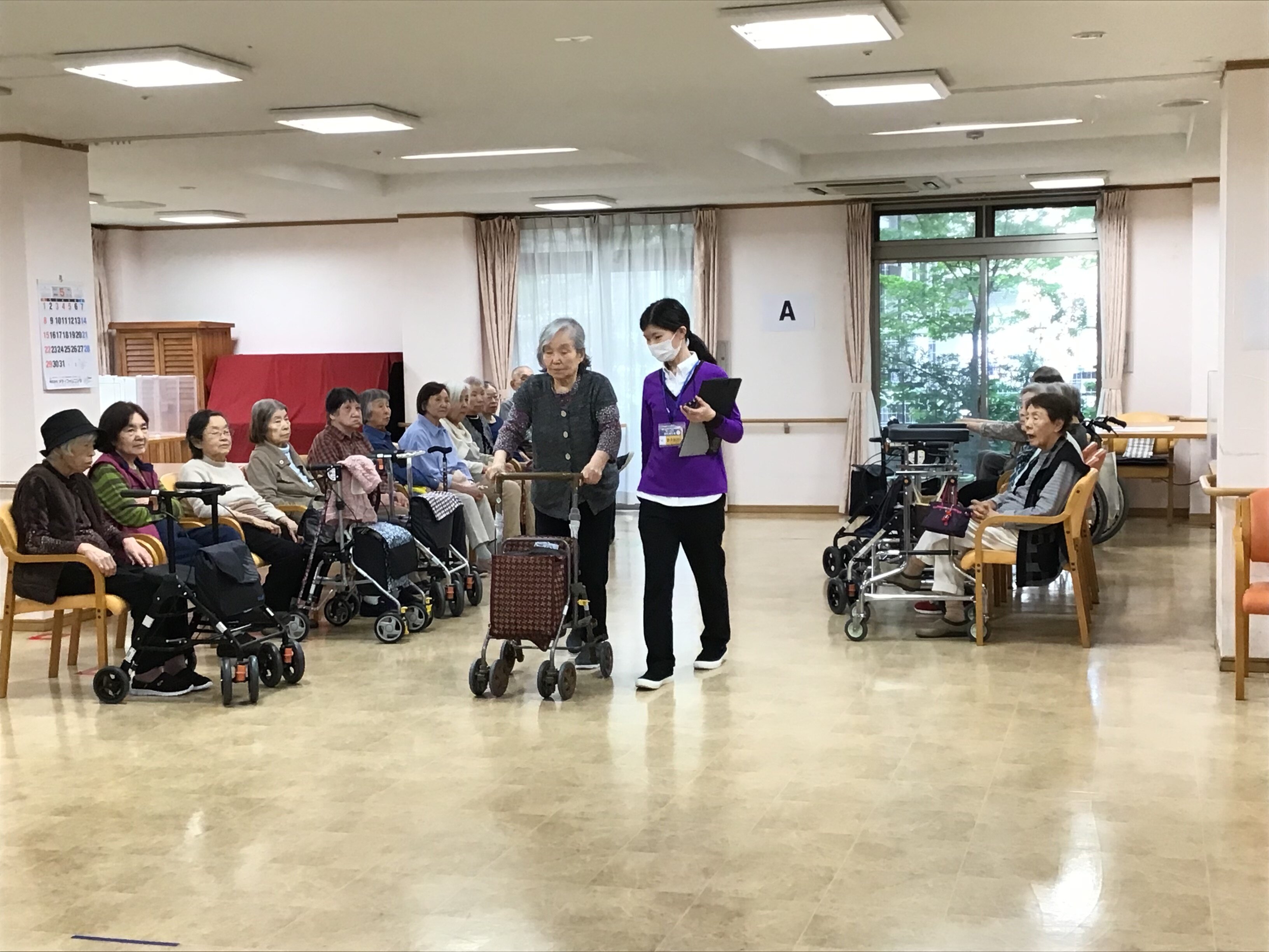 歩行や立位が難しい方は握力測定のみ実施し、歩行器を使用しておられる方や普段は車椅子で生活されているけどちょっと歩ける方など多種多様な体力測定となりました。