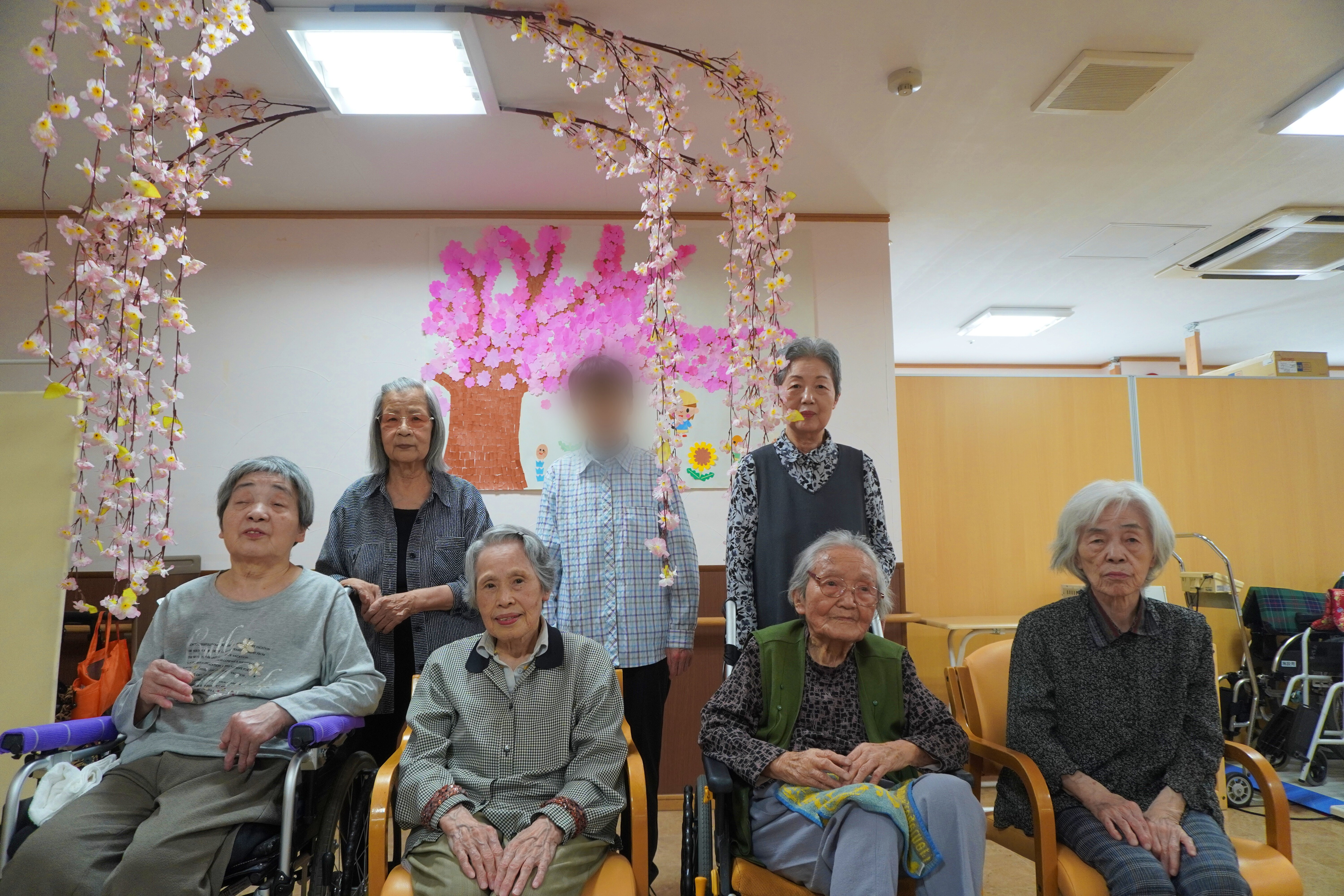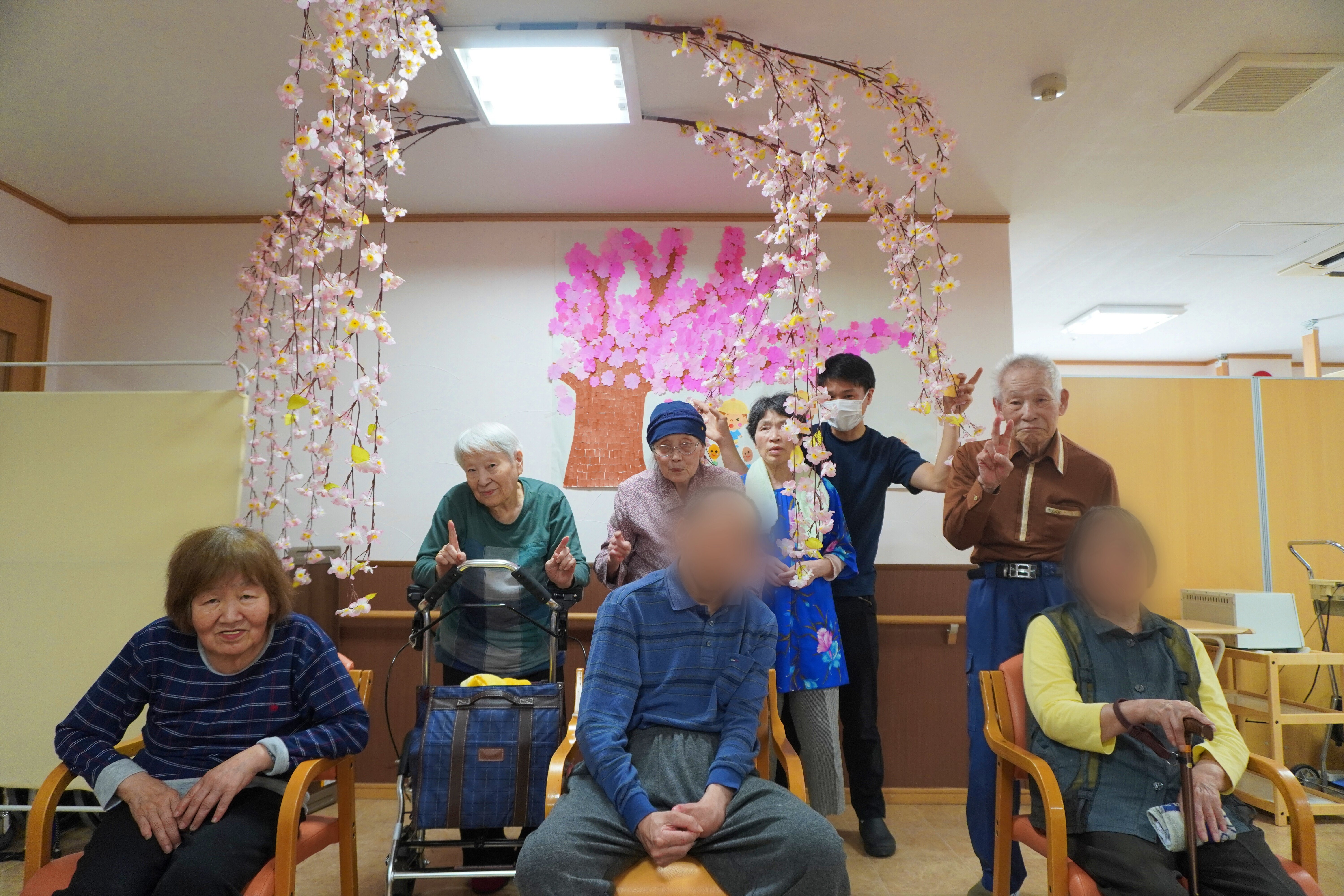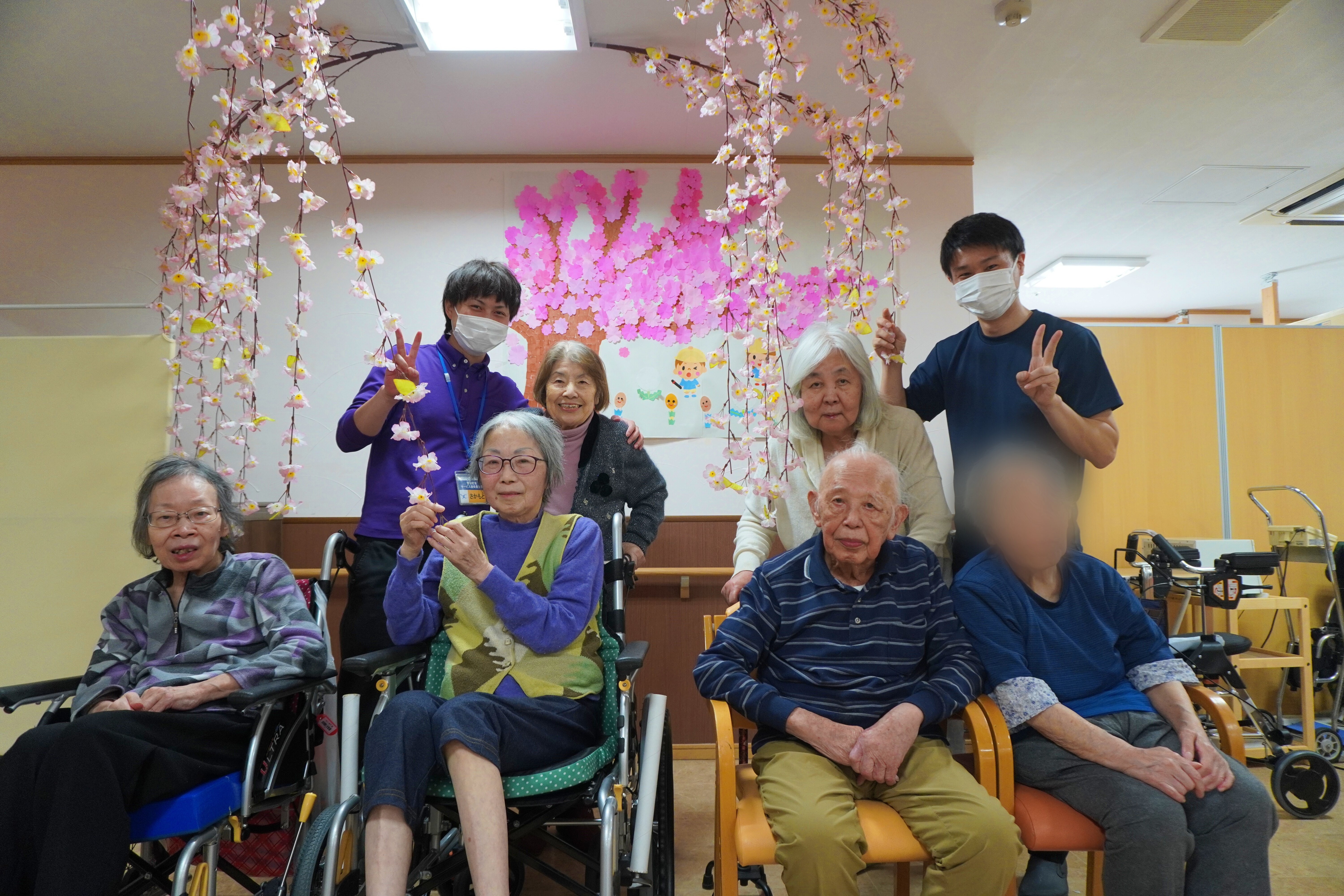 3月の折り紙レクで皆さんと作った桜&造花の枝垂桜を背景に写真撮影を行いました♪