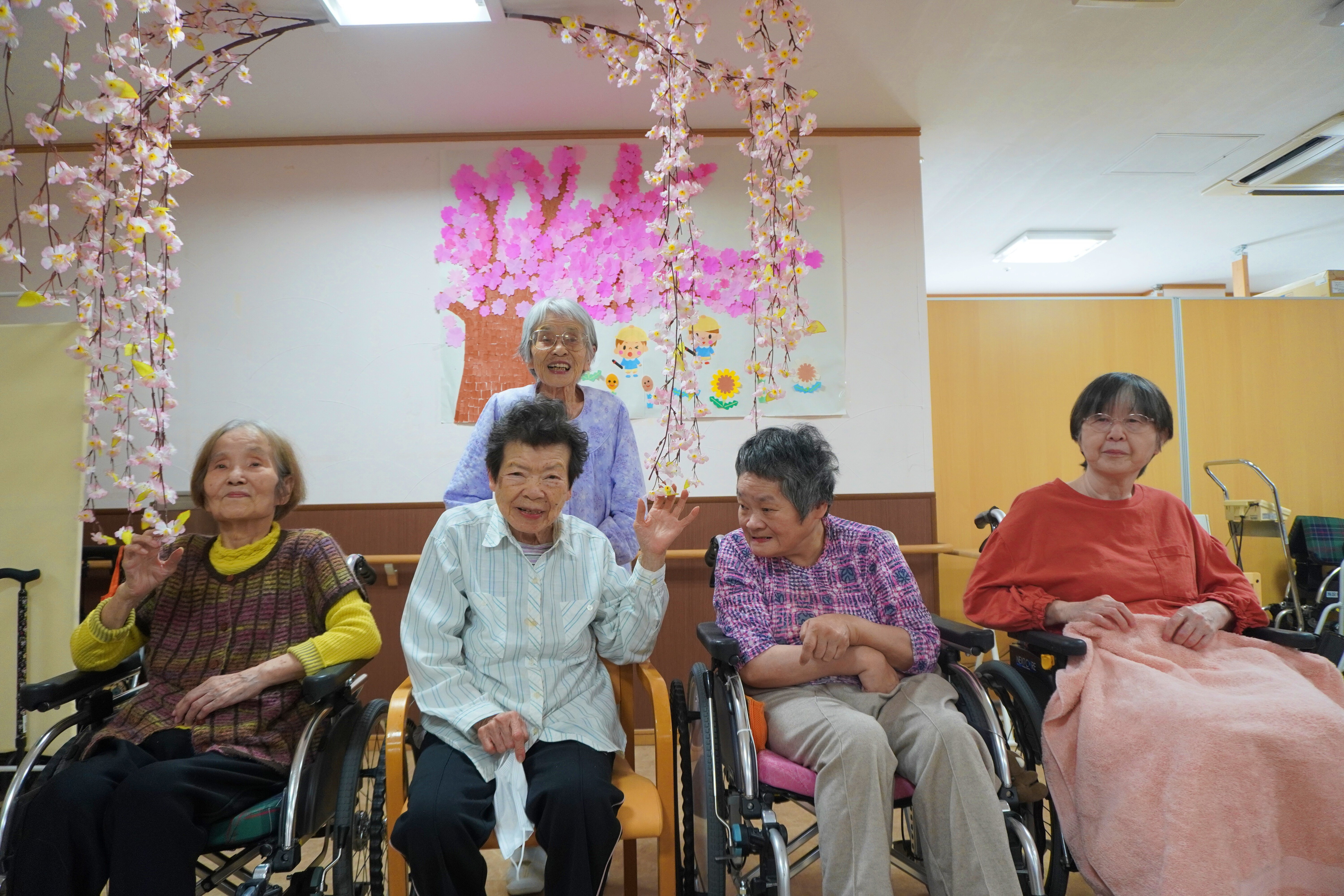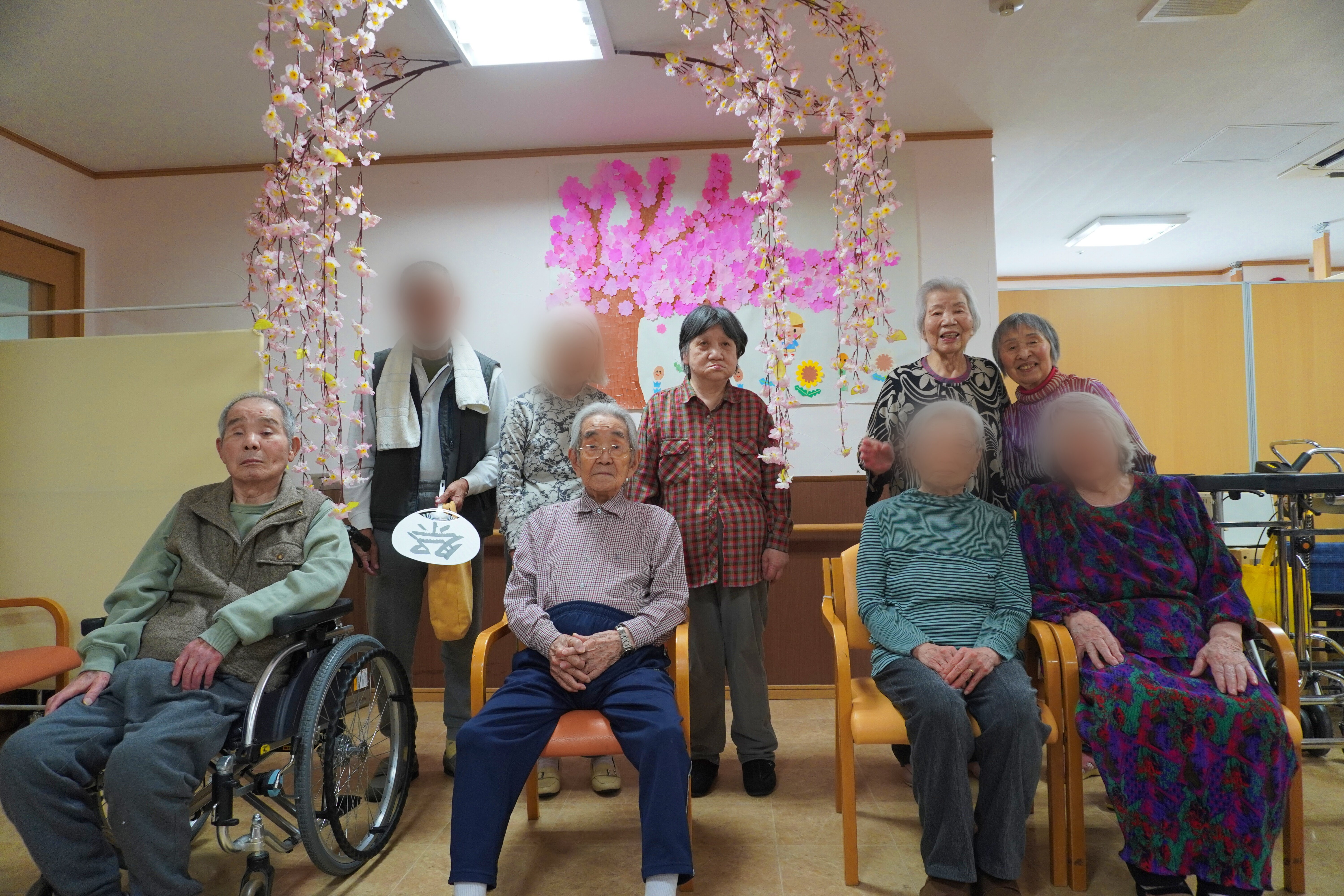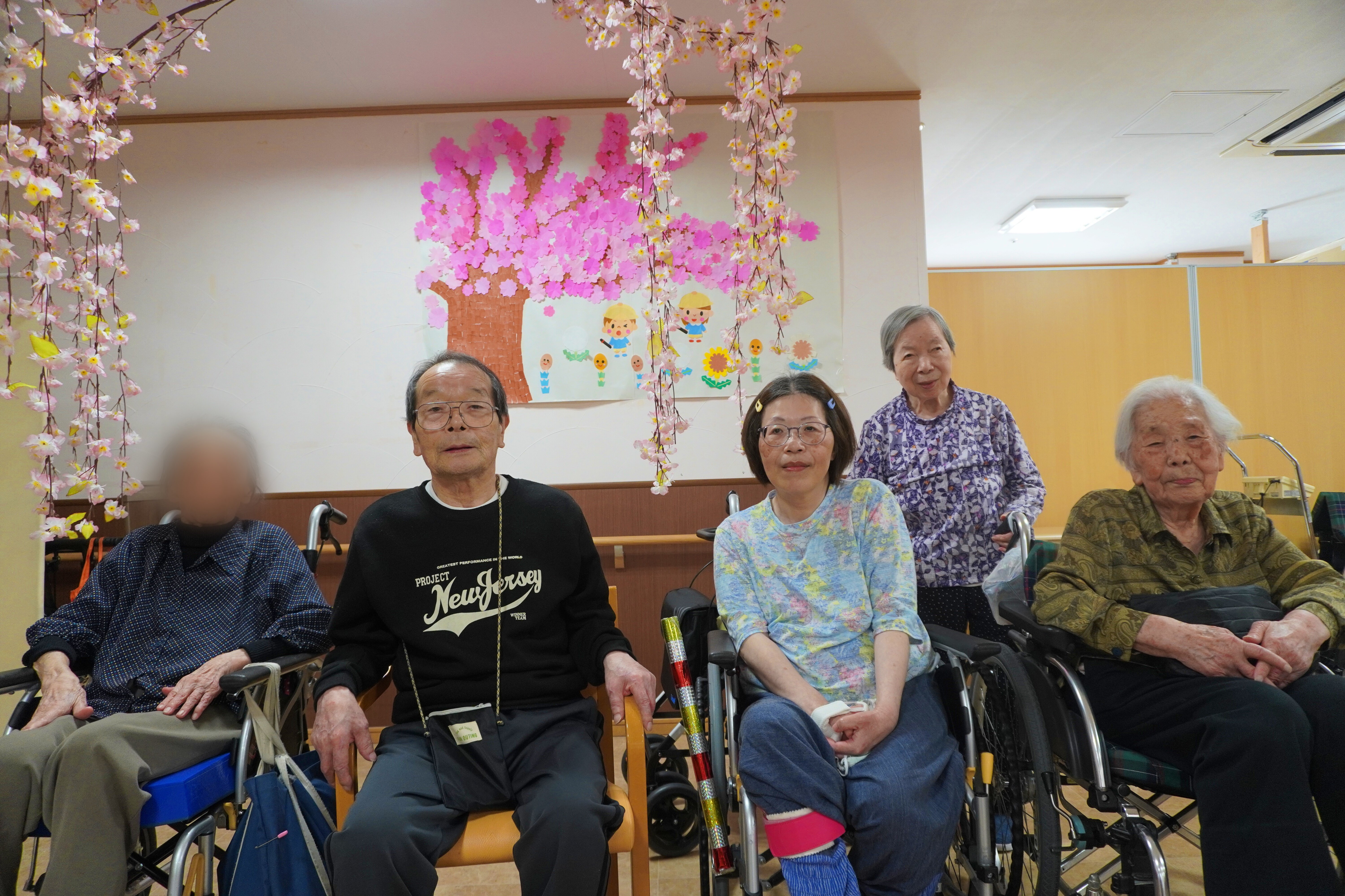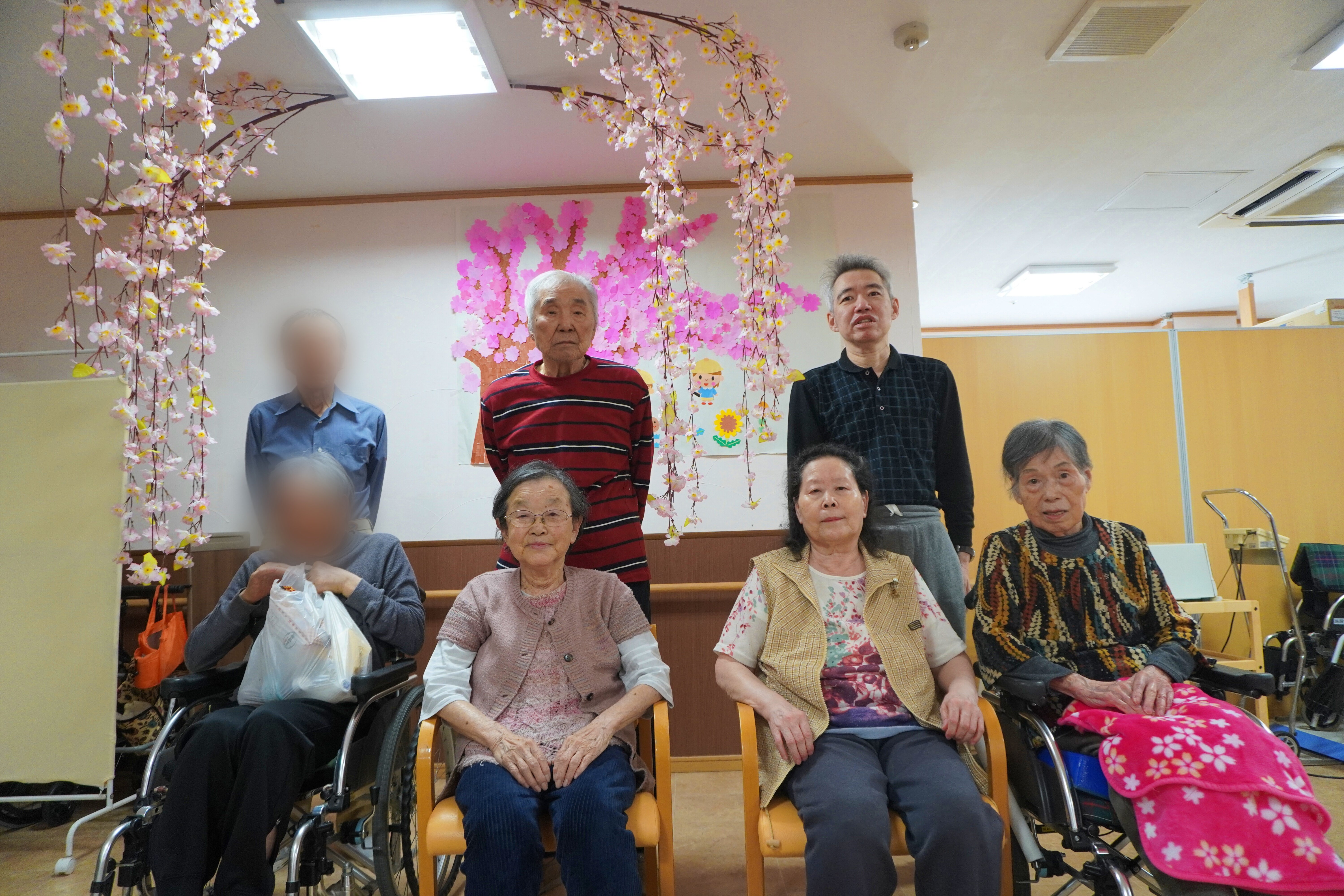 3月の折り紙レクで皆さんと作った桜&造花の枝垂桜を背景に写真撮影を行いました♪