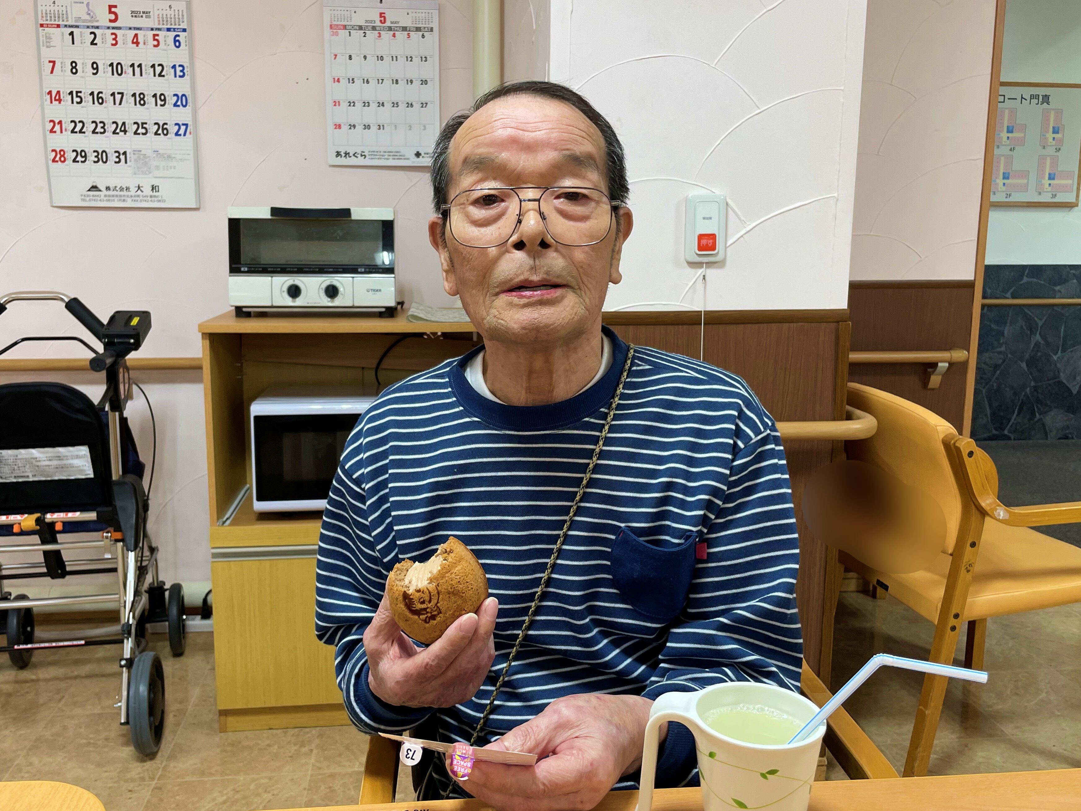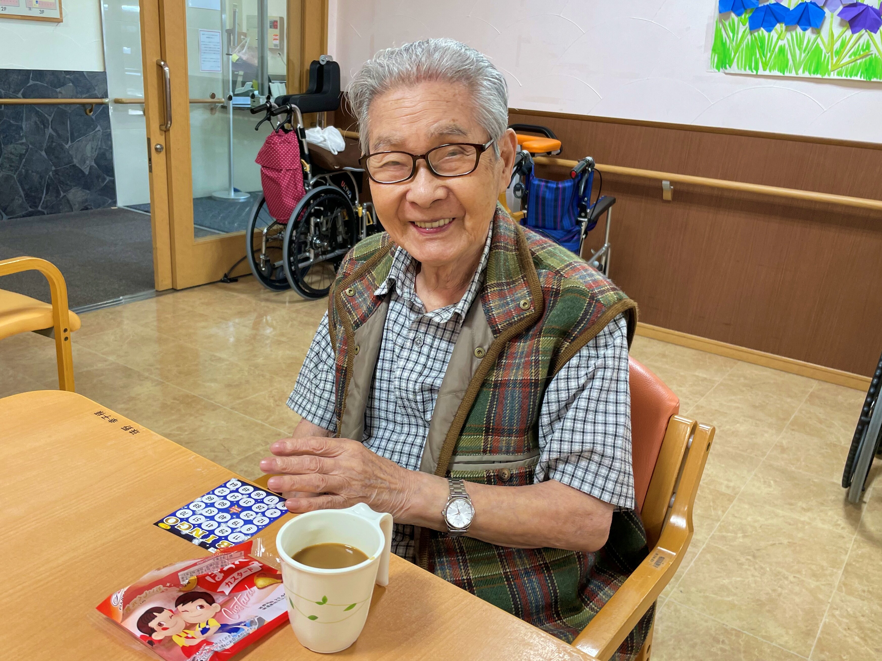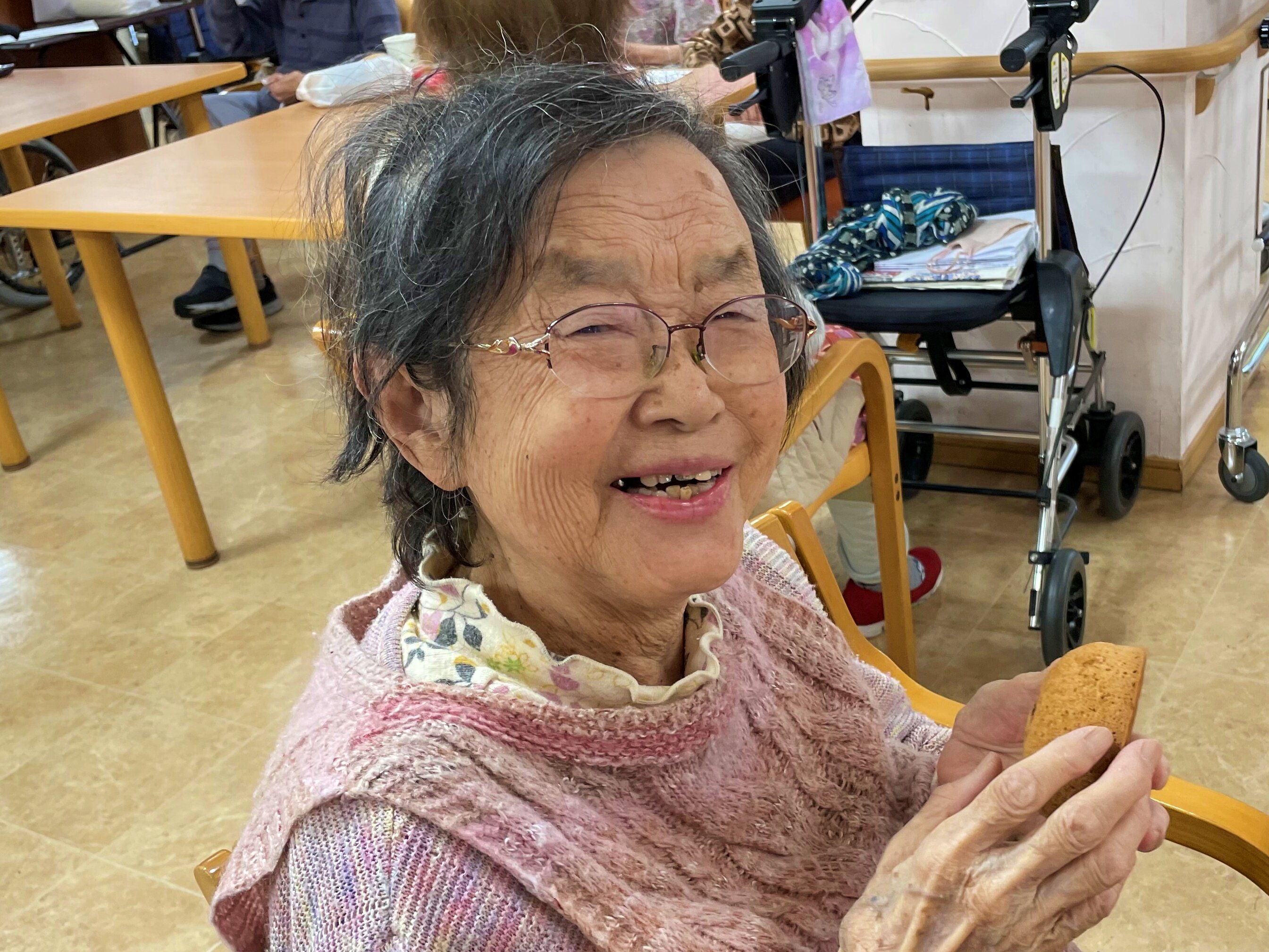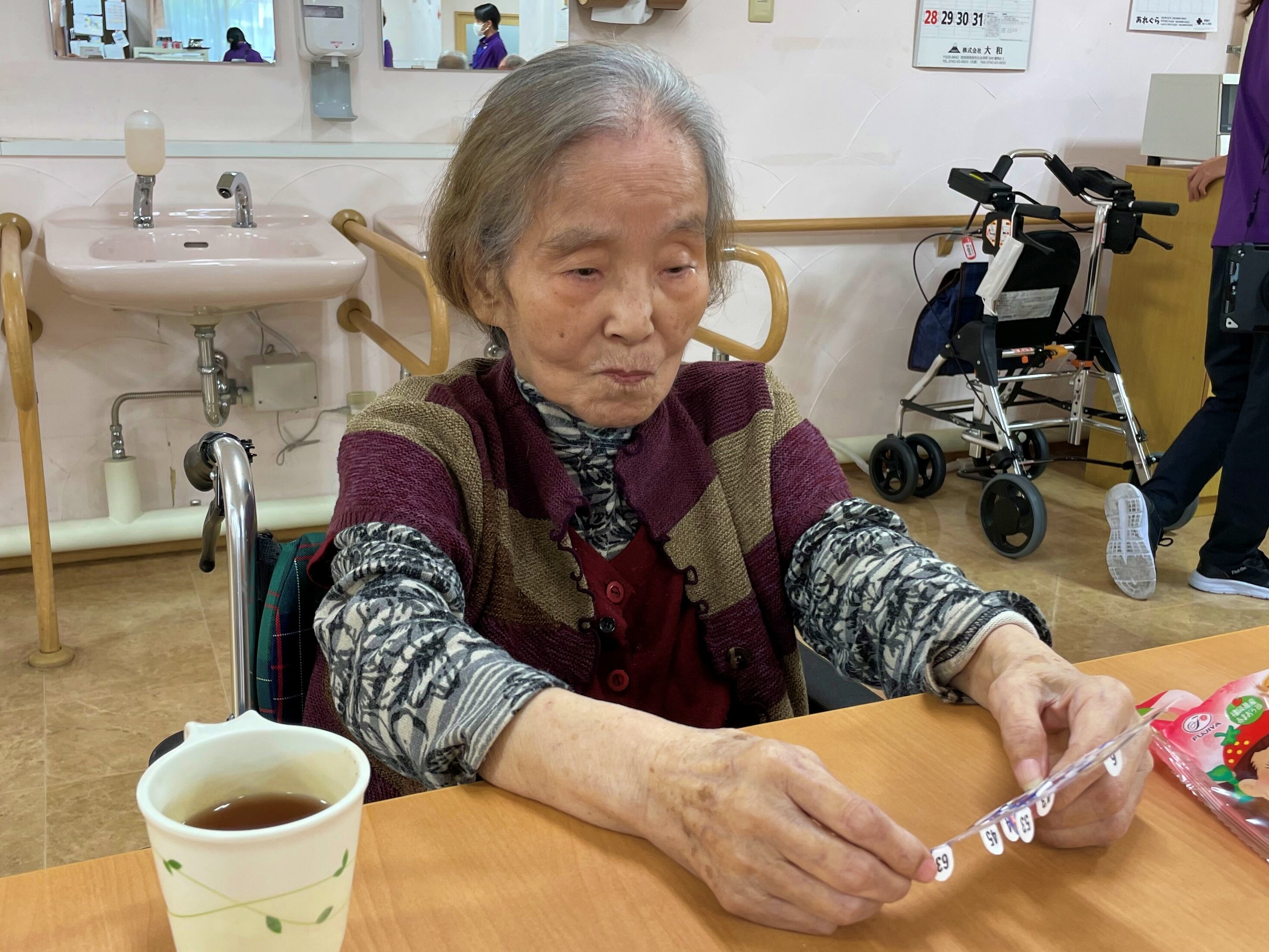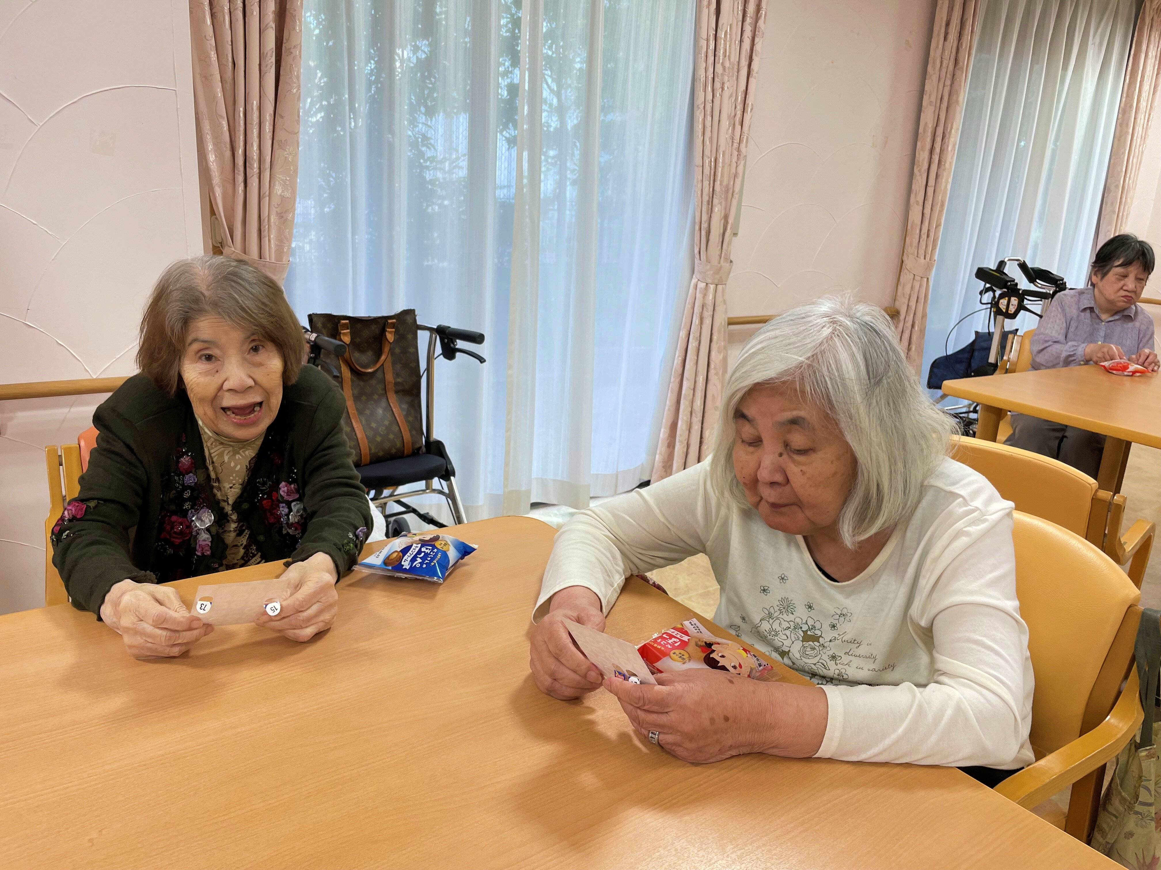 ビンゴカード片手に今回のおやつ「ペコちゃんのほっぺ」