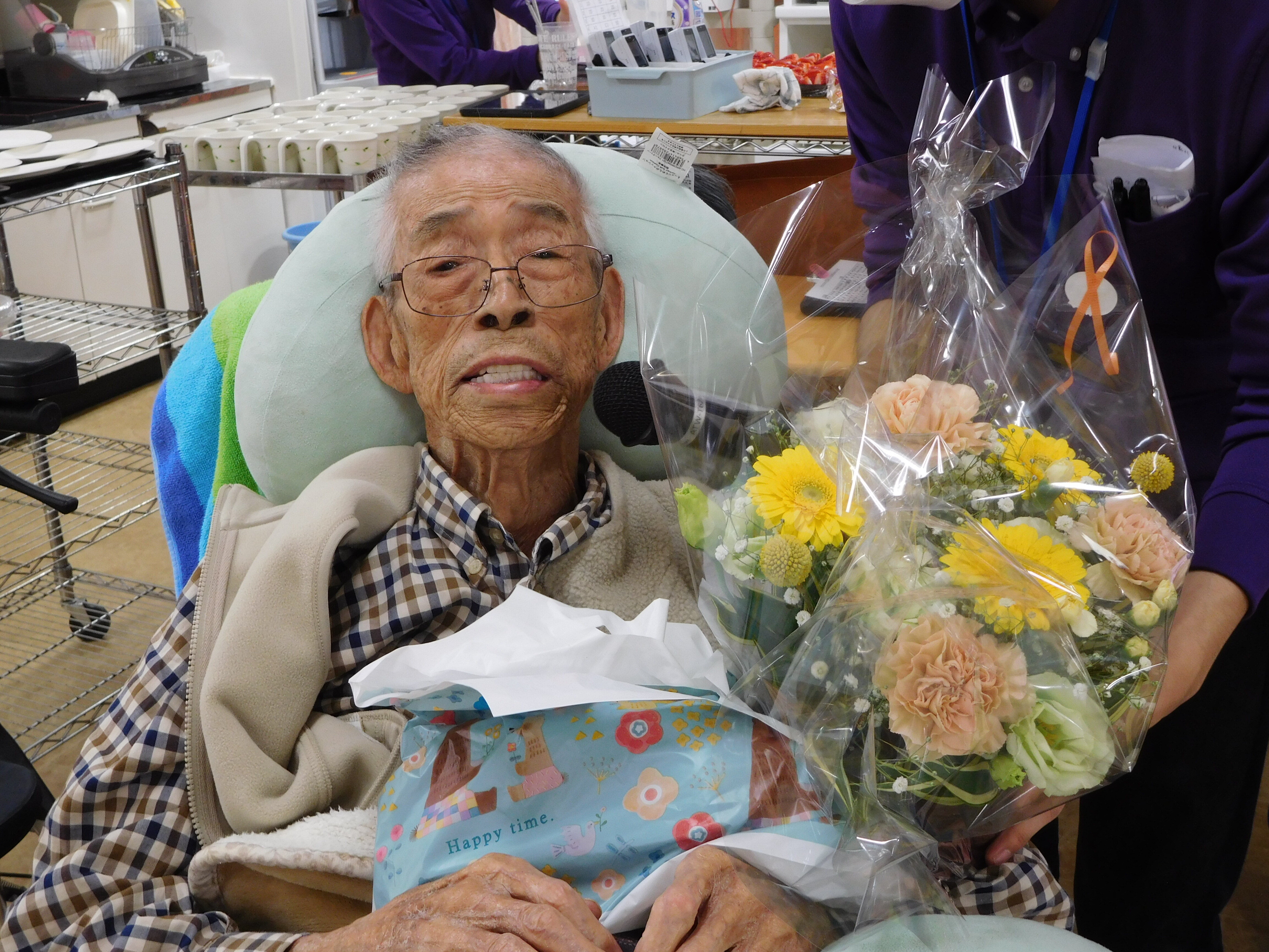 米寿のお二方には皆様と同様のプレゼントに加えて立派な綺麗ないい匂いがする花束をお渡ししました♪