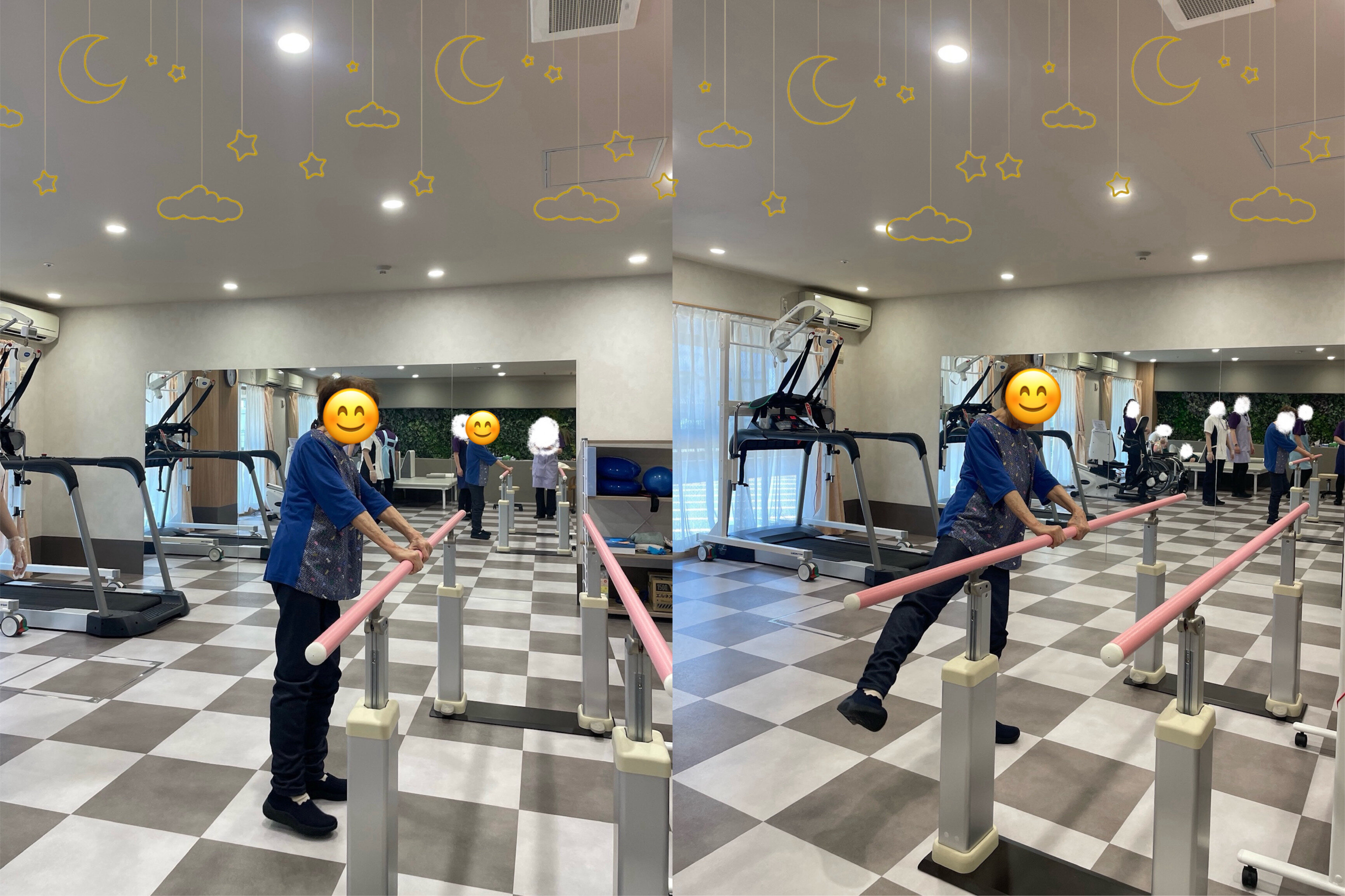 綺麗なリハビリ室で、理学療法さんとともに皆様毎日頑張られています(๑˃̵ᴗ˂̵)