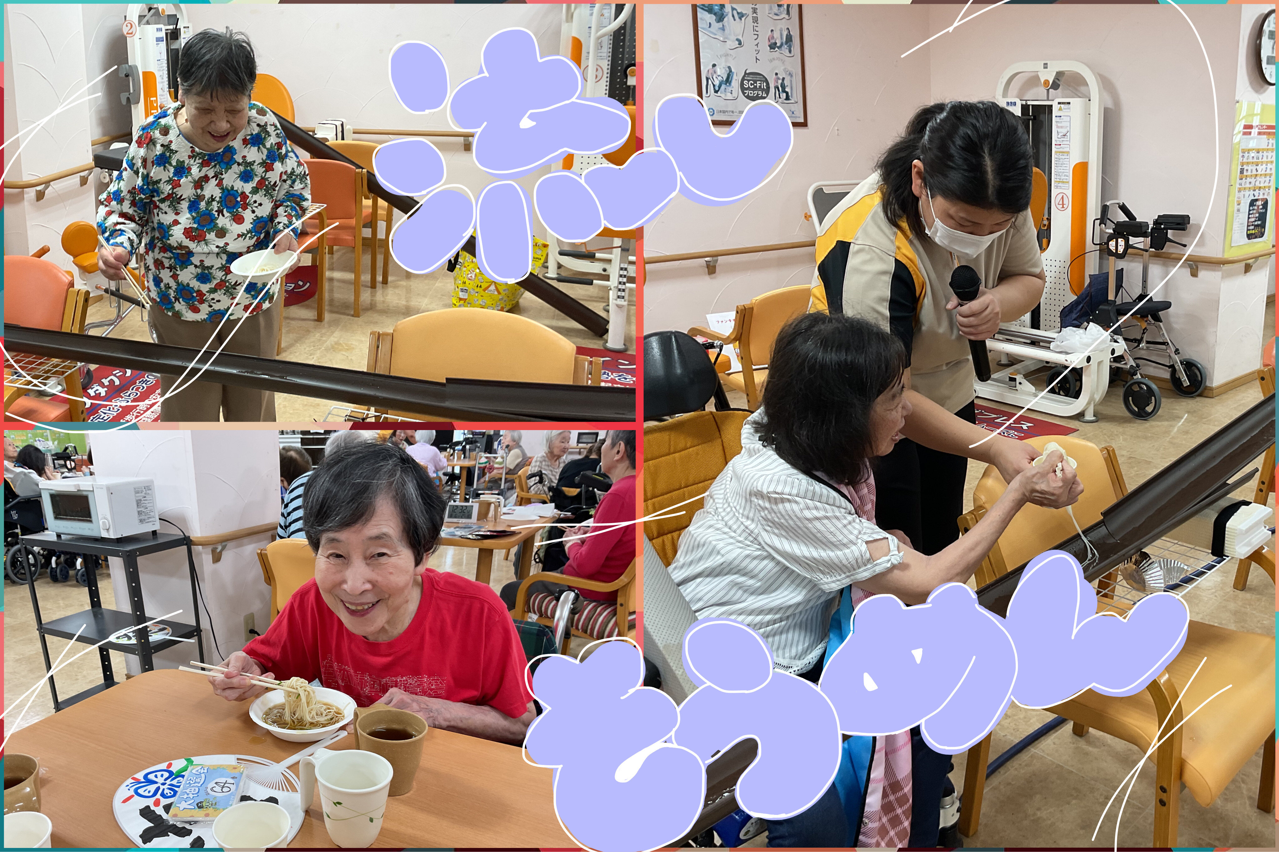 こちらは流しそうめん!例年施設前の屋外で行っていましたが、今年は暑さも厳しく、室内で行いました!