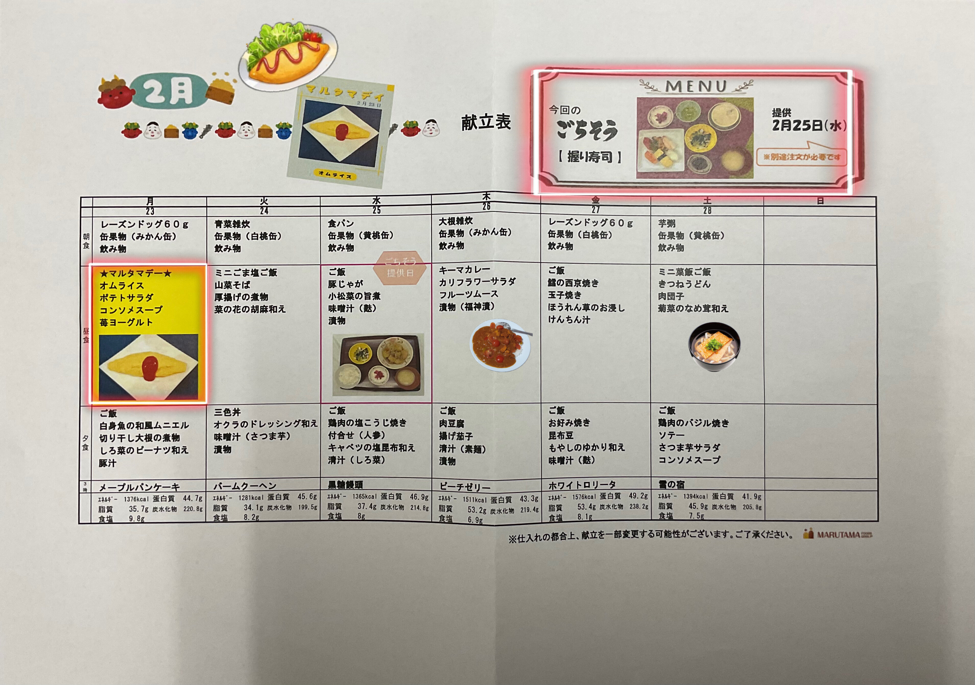 2/23(月)は、マルタマデーで、オムライス!!(๑˃̵ᴗ˂̵)