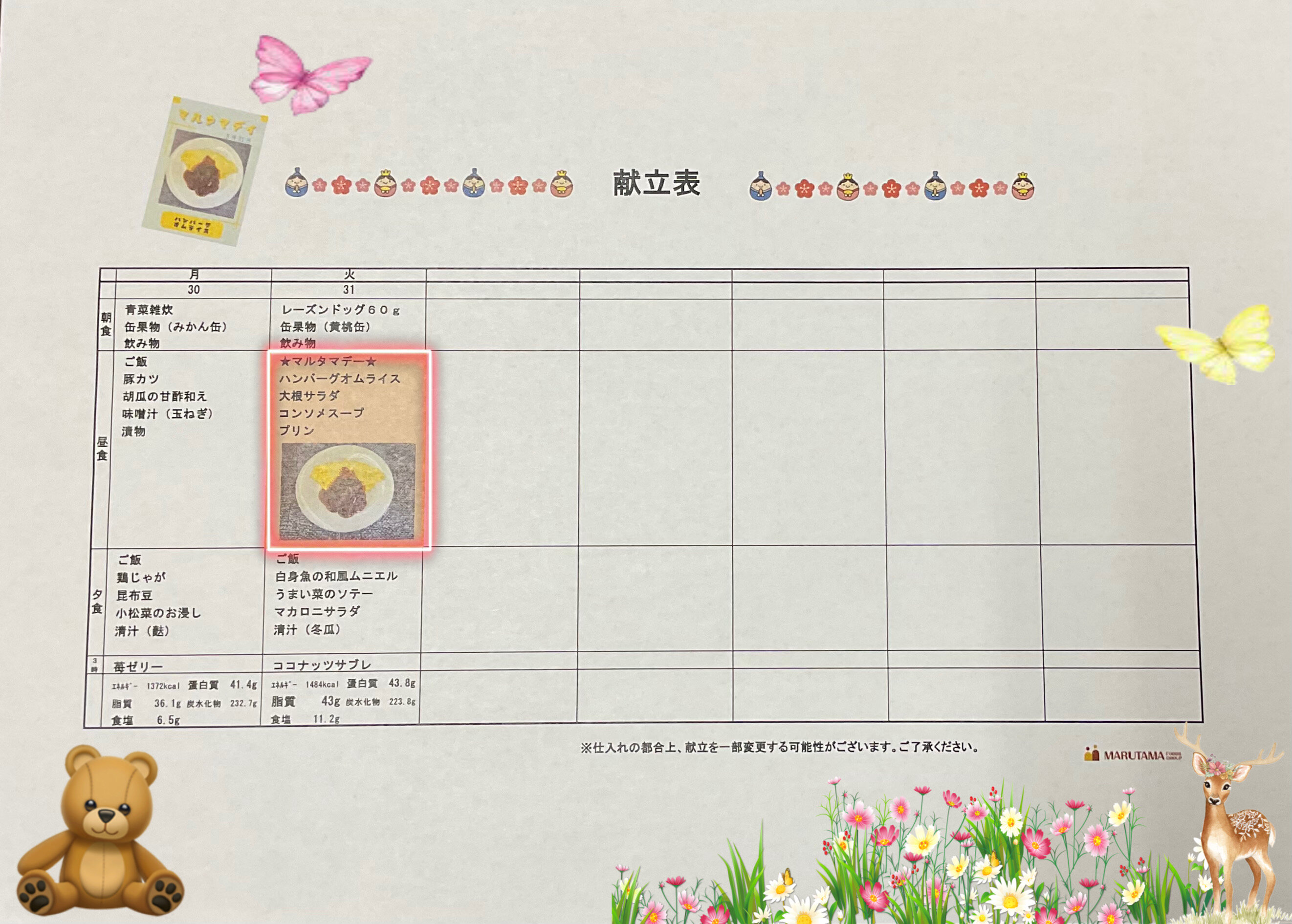 3/31(火)はマルタマデイでハンバーグオムライスですね!(๑˃̵ᴗ˂̵)