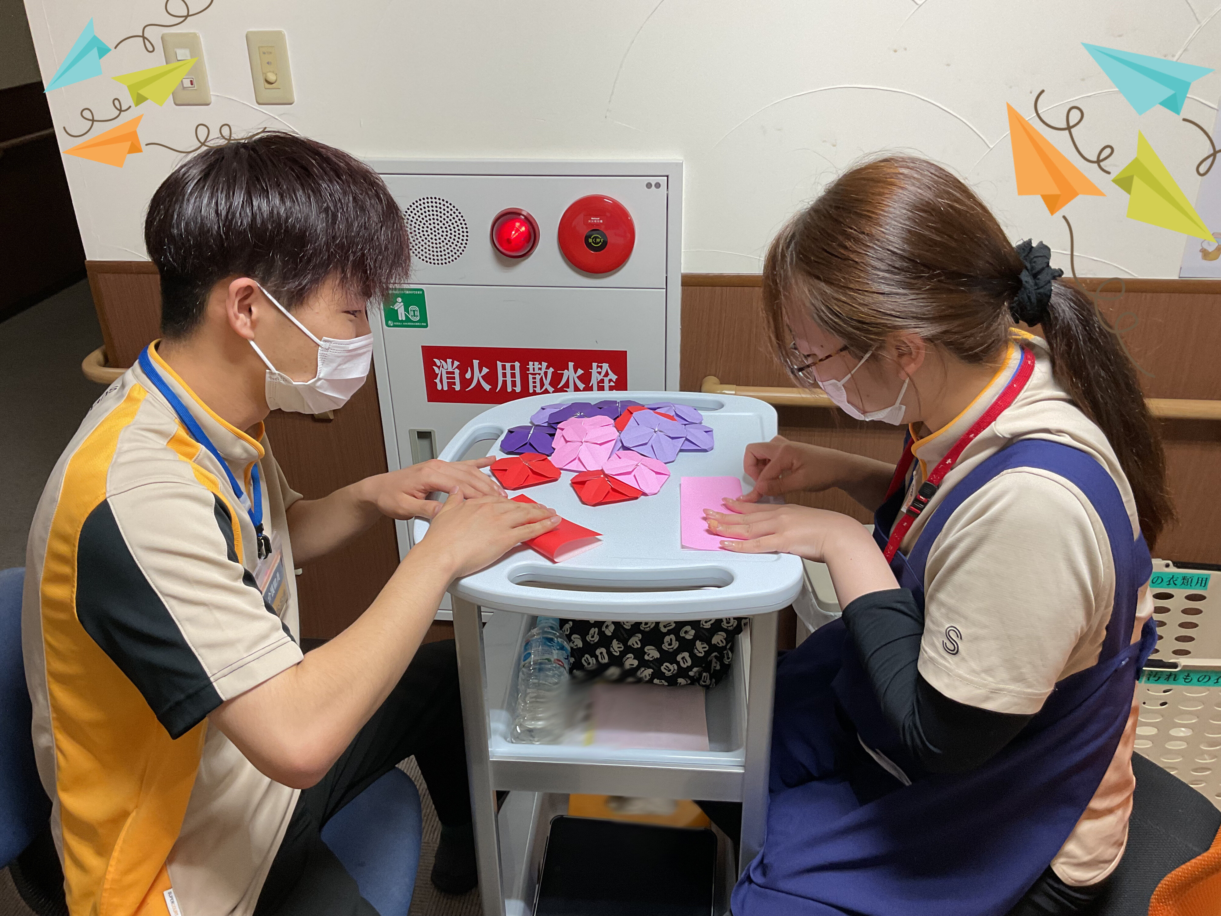 夜間、隙間時間を見つけて、食堂に飾り付けする折り紙を頑張って作ってくれています(*´꒳`*)