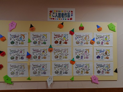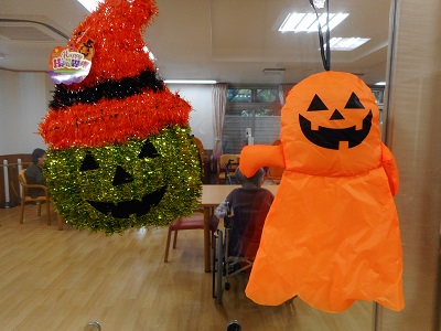 施設もハロウィンの飾り付けや入居者様力作のハロウィン塗り絵や折り紙での飾りつけも場を盛り上げました♪